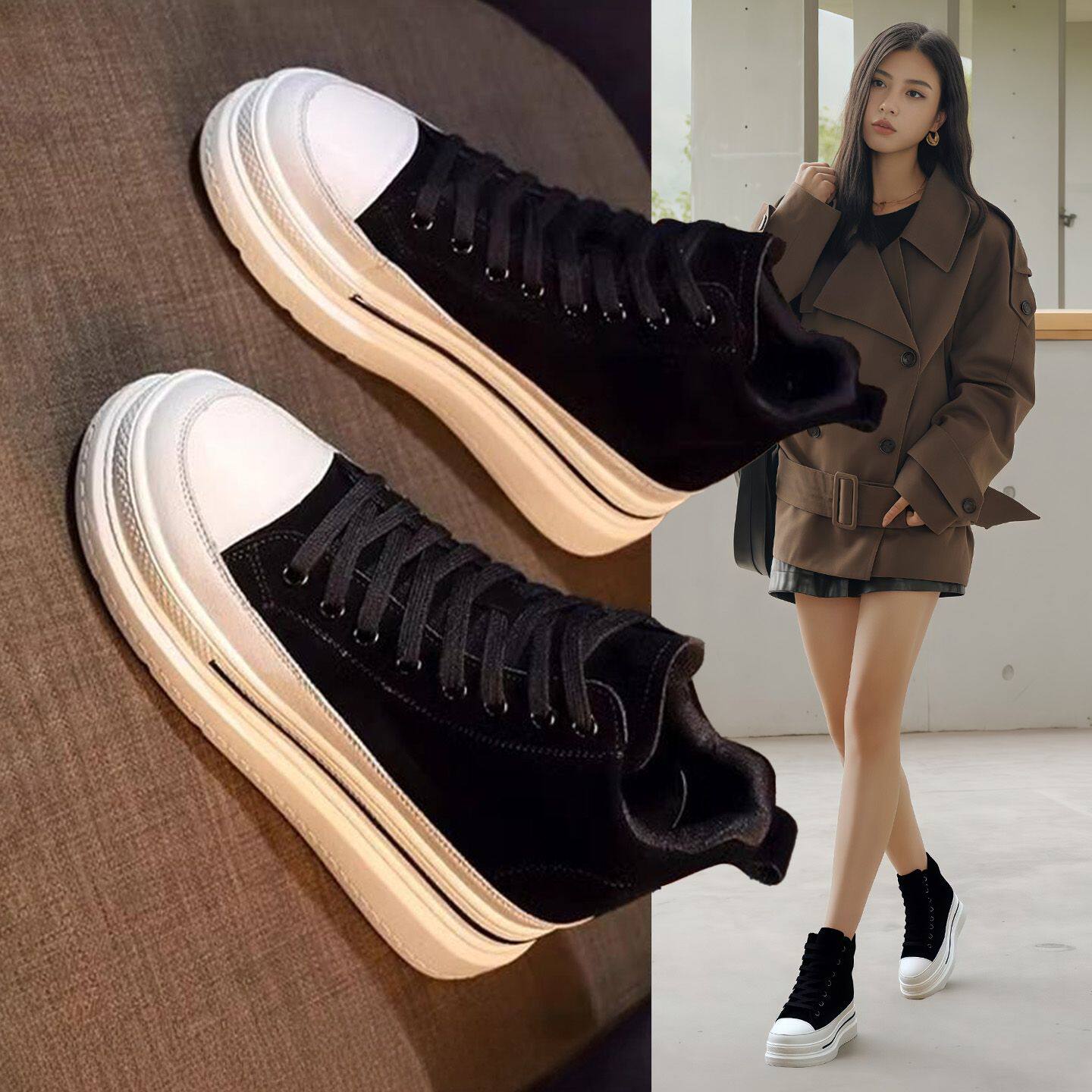 Hong Kong genuine leather versatile platform casual board shoes women's 2025 spring and autumn height increase sports high-top Korean version fleece single shoes