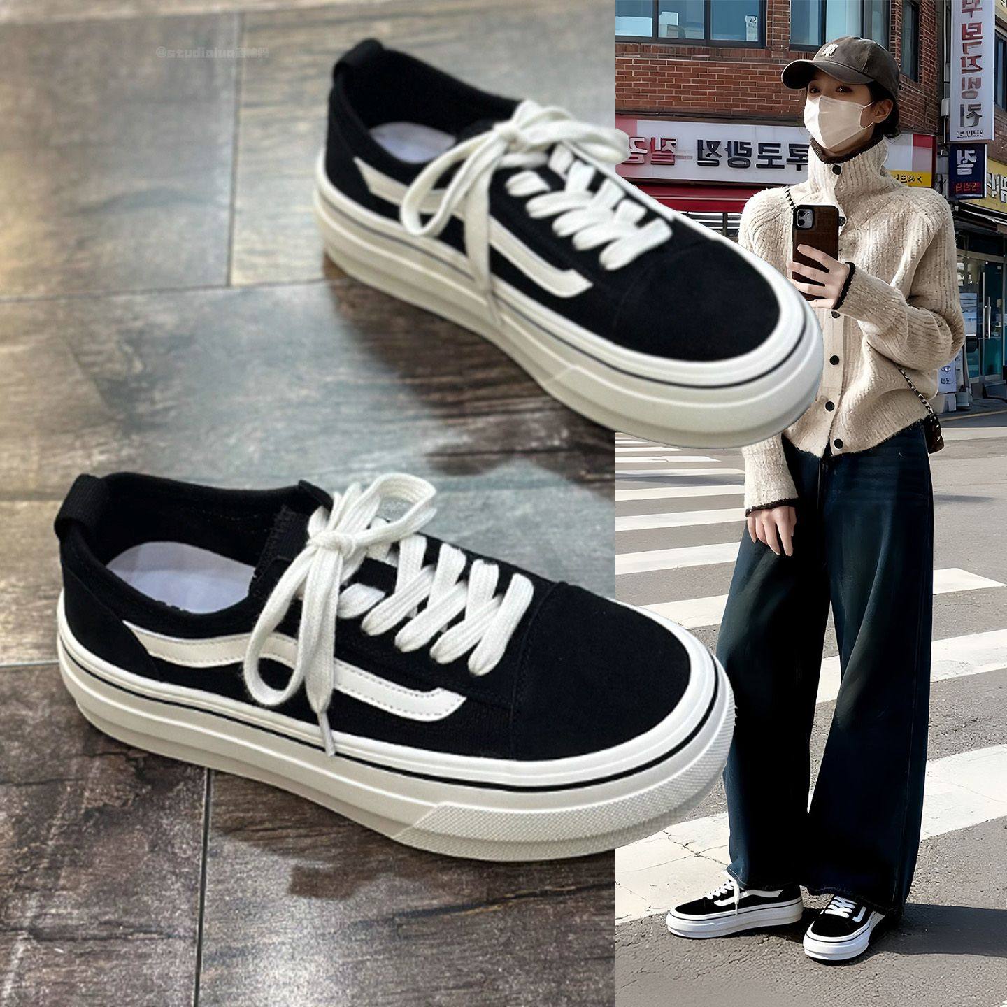 Hong Kong ins super hot spring and autumn high-top shoes women's canvas platform flat lace-up leather versatile sneaker shoes daddy