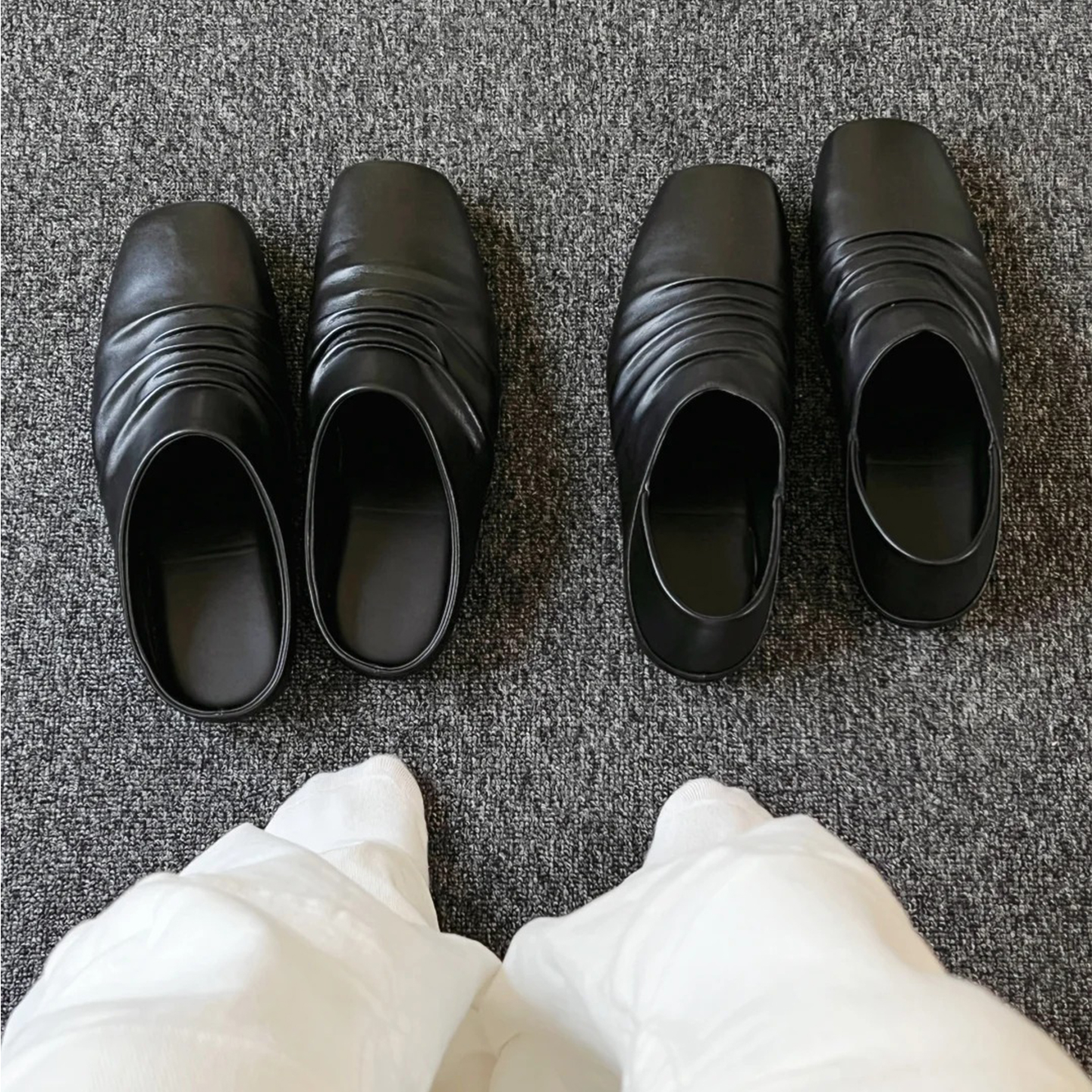 Lazy feeling ~ Pleated flat soles wear slippers on the outside of men's and women's toe wraps, semi-cushions square toe mules, and heightened commuter leather shoes inside