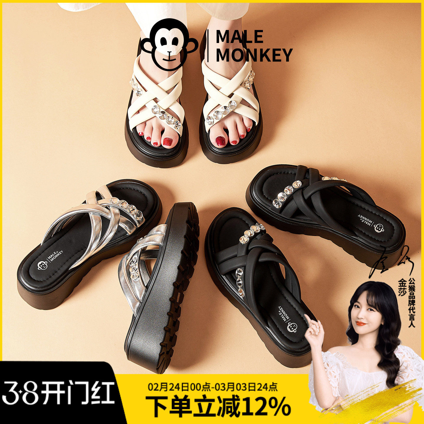 Male monkey muffin platform sandals women's new summer heightening rhinestone cross belt beach shoes with skirt women's slippers