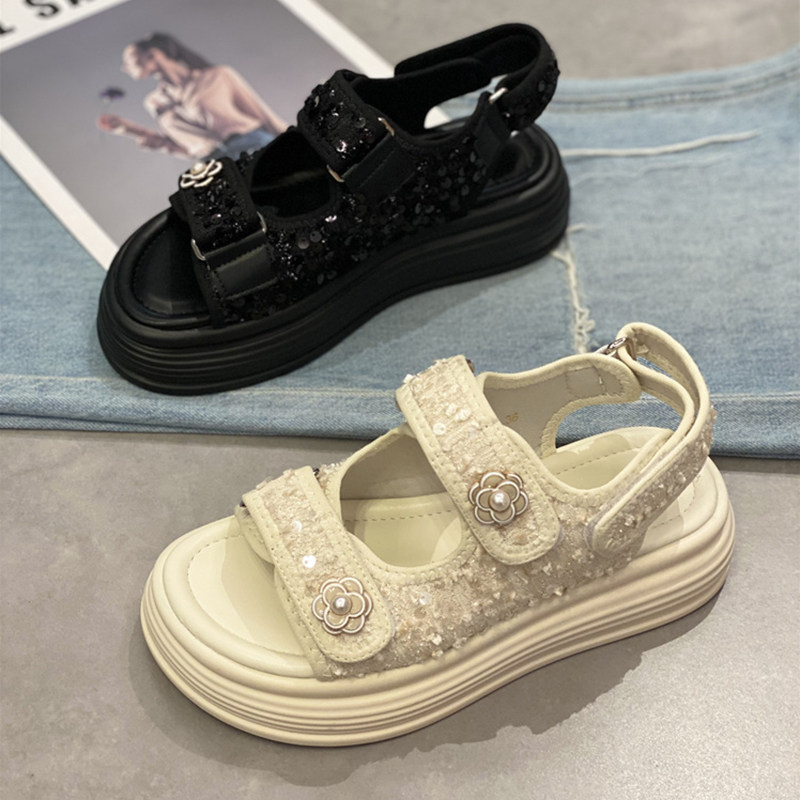 Thick-soled small fragrant style Roman sandals women's 2024 summer new Velcro beach beach casual sequins open-toe sandals