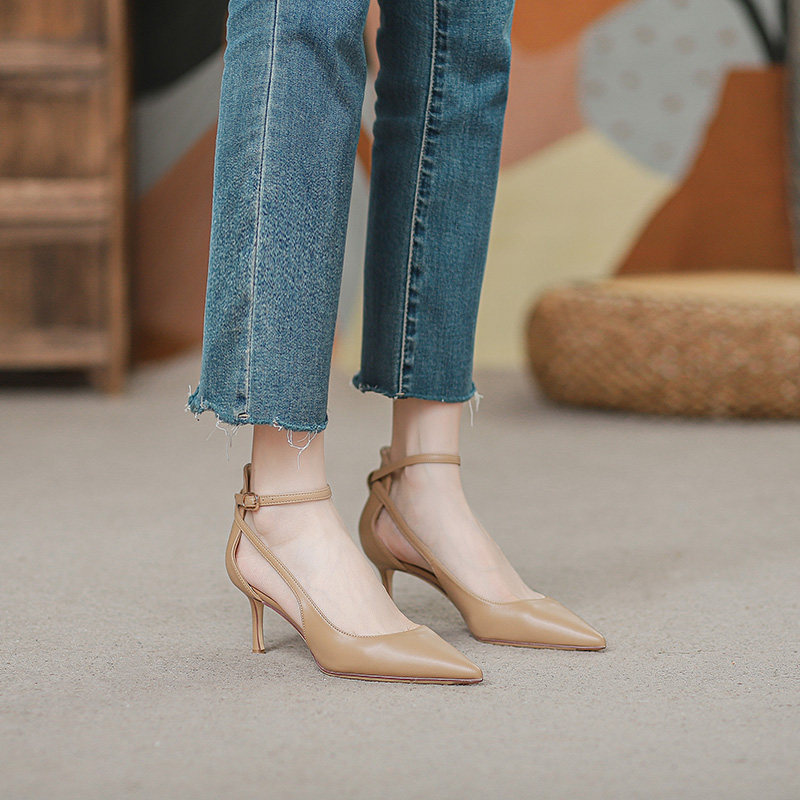 Feiyan women's shoes 2025 spring/summer new French pointed high heels women's stiletto heels buckle toe sheepskin sandals