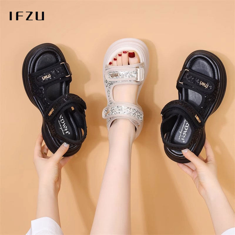 Genuine leather platform sports sandals women's summer 2025 new small fragrance style Velcro sequins height-increasing casual beach shoes