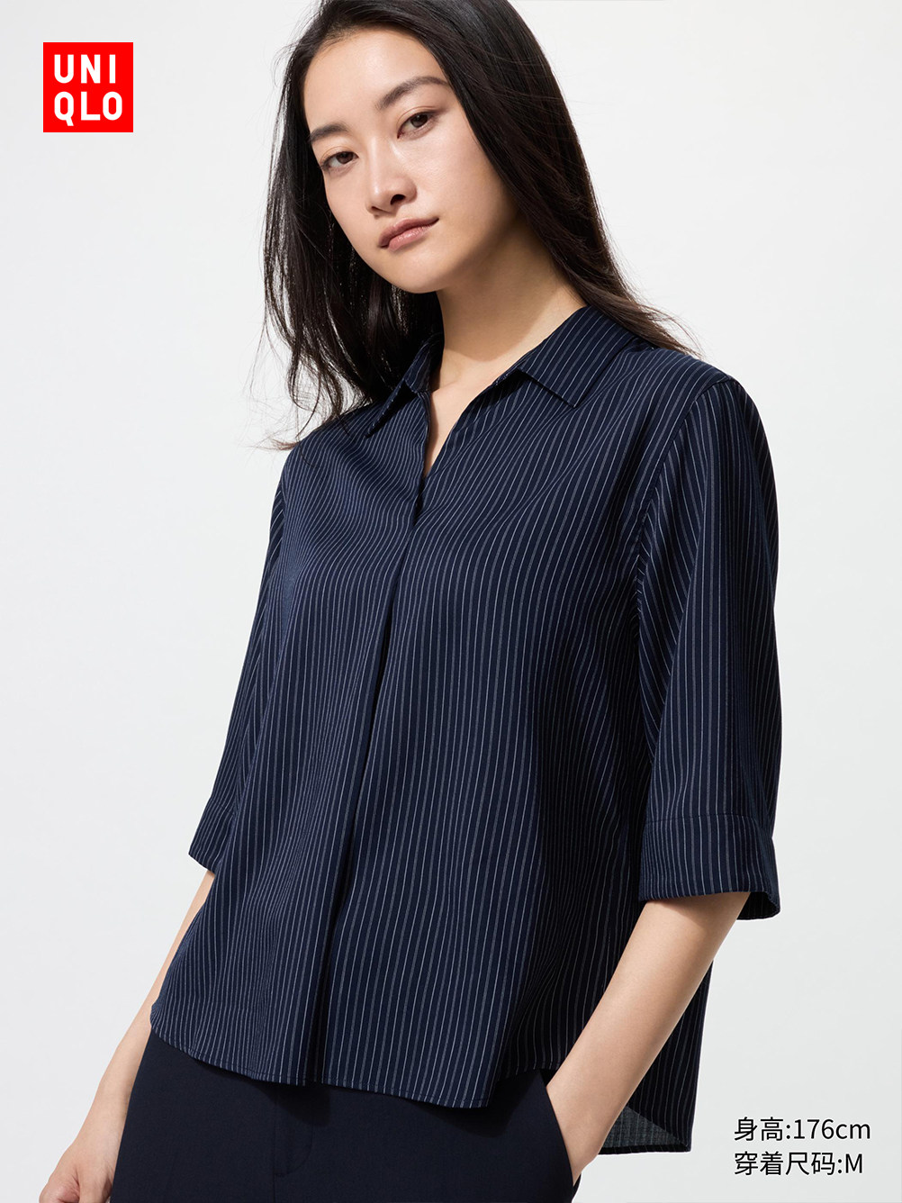 Uniqlo Women's Fancy Half-Open Collar Striped Shirt/7/8 Sleeve Shirt Air Conditioning Shirt 479074
