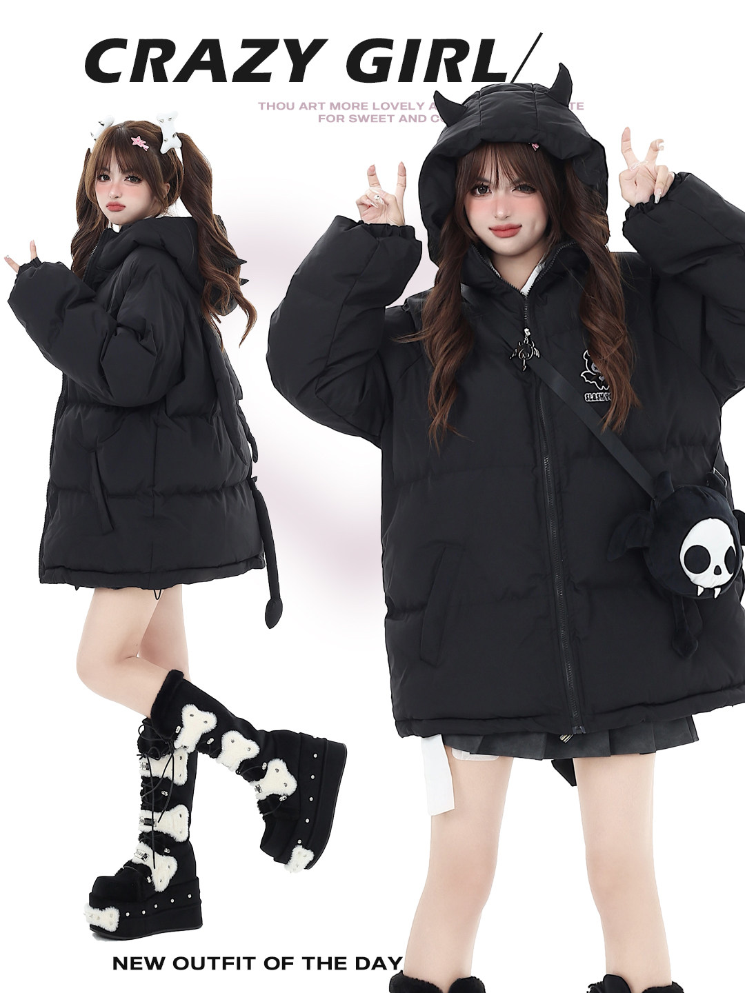 Crazygirl Sweet and Cool Three-Dimensional Little Devil Thickened Warm Loose Cotton Coat for Winter (Comes with a Devil Crossbody Bag)