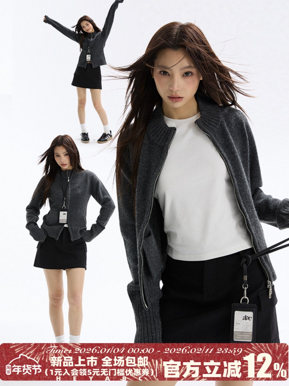 Heyabc Double-Zip Slim-Fit Knit Cardigan with Korean-Style Short Base Sweater in Dark Gray Pullover Top
