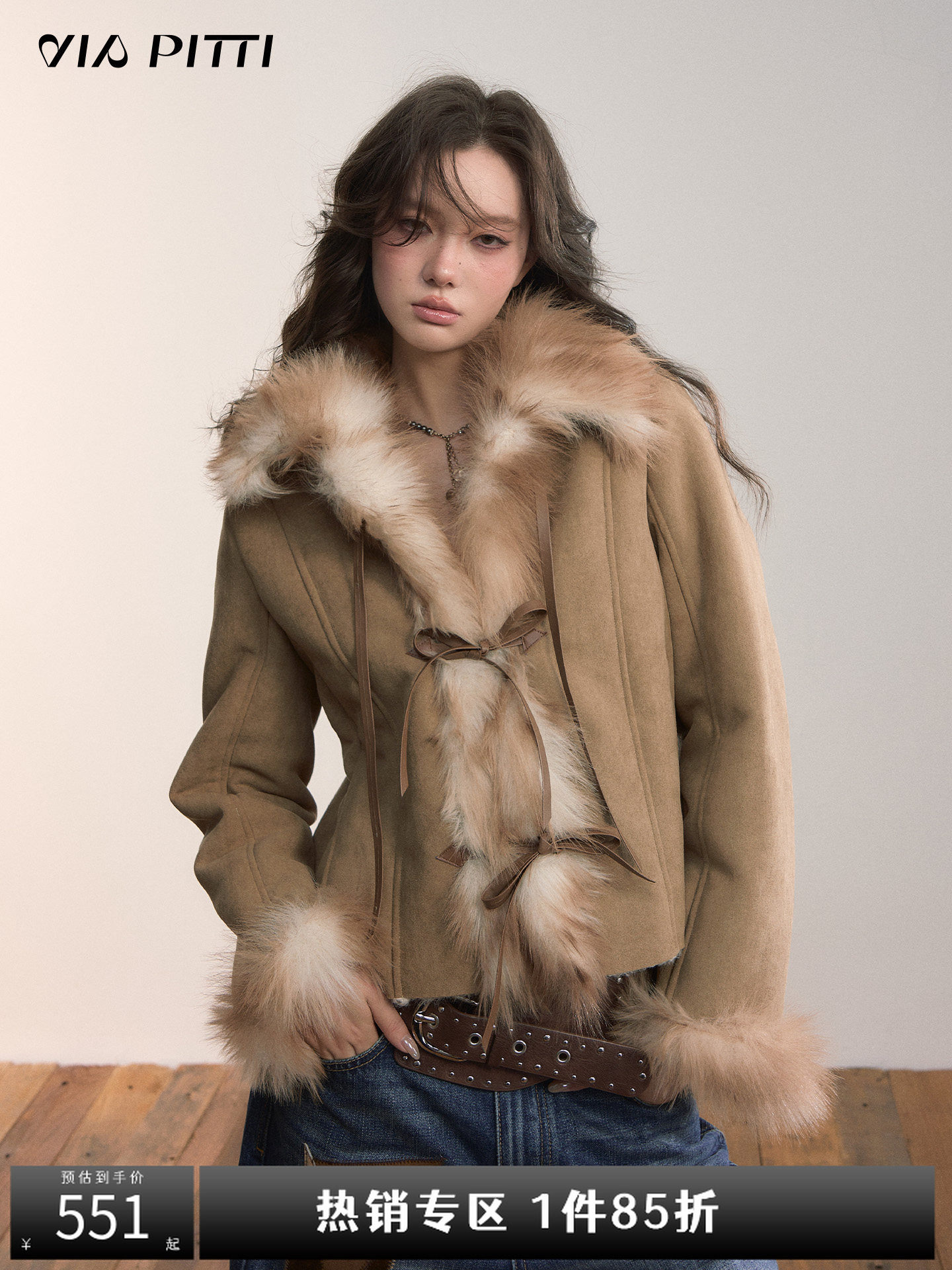 Viapitti Design-Focused Heavy-Duty Bow-Tie Faux Fur Integrated Coat for Women, Autumn and Winter Large Fur Collar Top