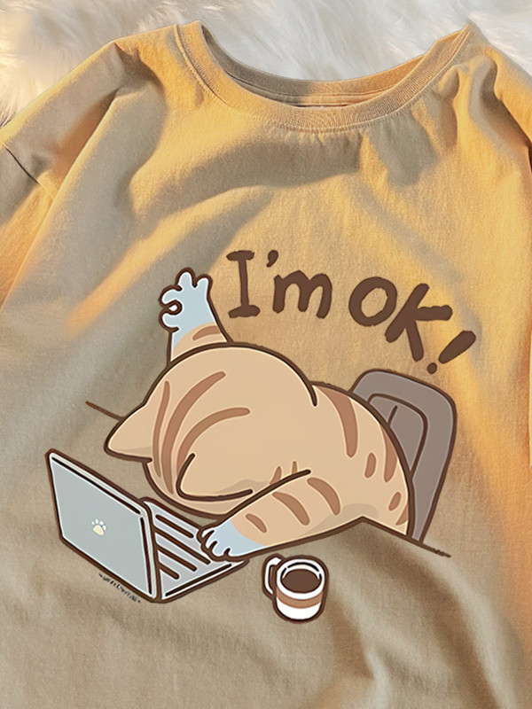 Pure Cotton Short-Sleeve T-Shirt for Men and Women, New Summer Style, Imok Work Cat Design, Loose Fit, Plus Size, Student, Niche Top