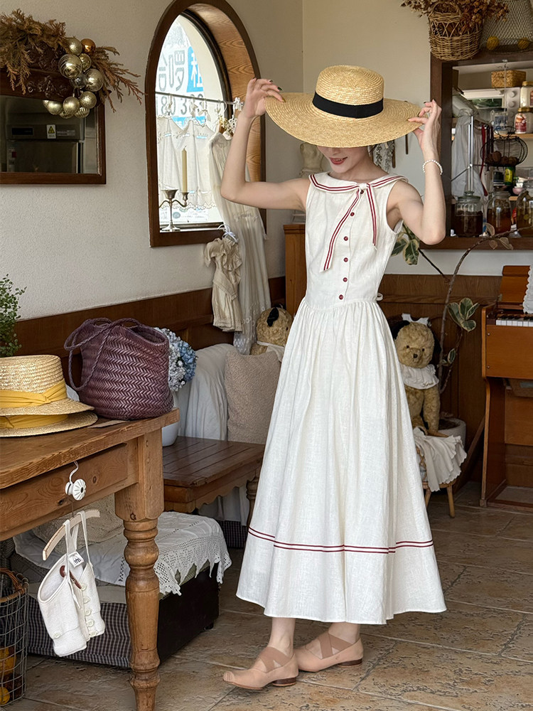 Three Tailors French-Style Youthful Color-Blocked Bow Dress for Women, Summer Waist-Cinching Long Dress That Makes You Look Fairer 07175