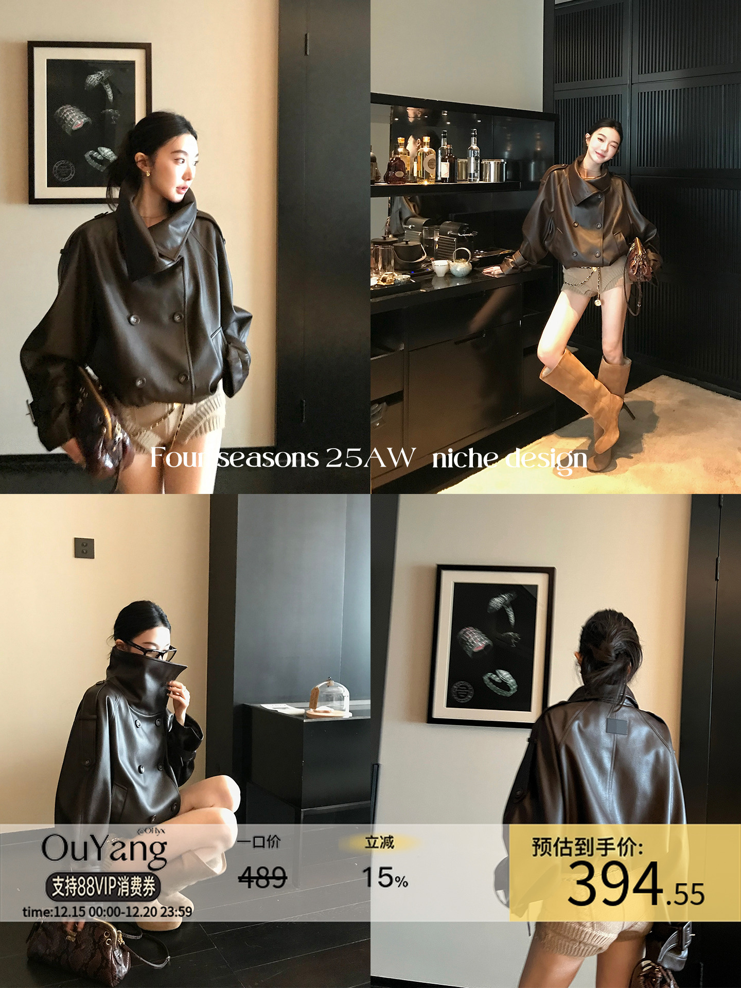 Ouyang Brand Large Lapel Lychee Pattern Pu Leather Jacket for Women, Winter High-End Double-Breasted Vintage Leather Jacket