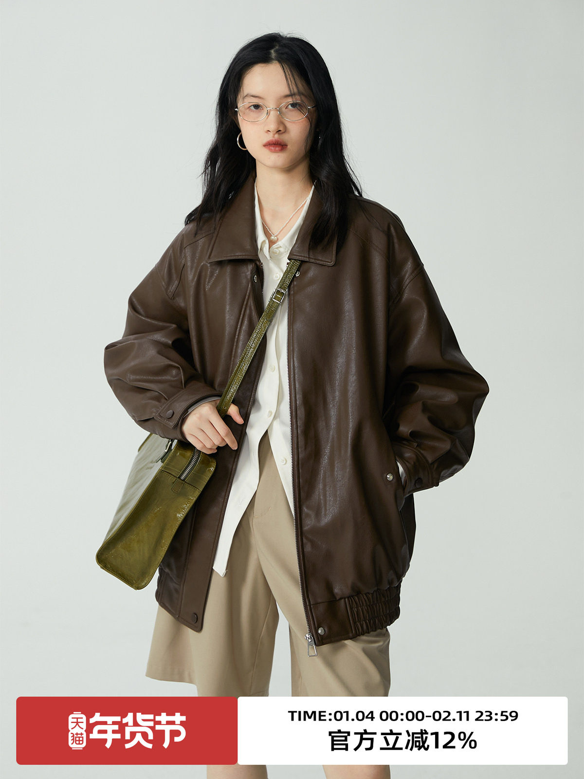 Omont Egg Tart House Brown Leather Jacket Women's New Vintage Loose Motorcycle Short Jacket Women's Spring and Autumn