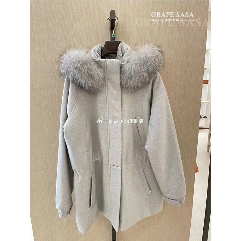 【Grape Sasa】L Classic Icery Premium Heavy Cashmere Jacket Silver Blue Fox Fur Milk Gray Coat