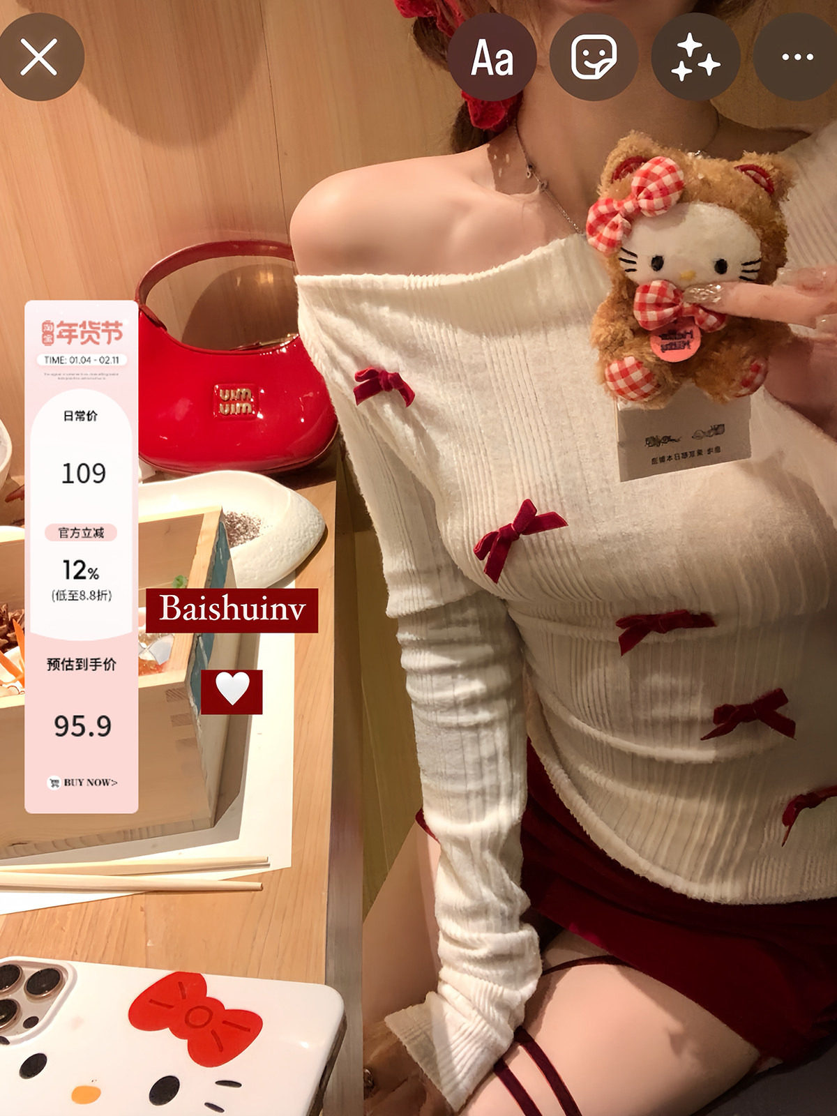White Water Women's Velvet Bow New Year's Atmosphere Off-Shoulder Top Women's Winter Long-Sleeve Slim Fit Off-Shoulder Base Shirt