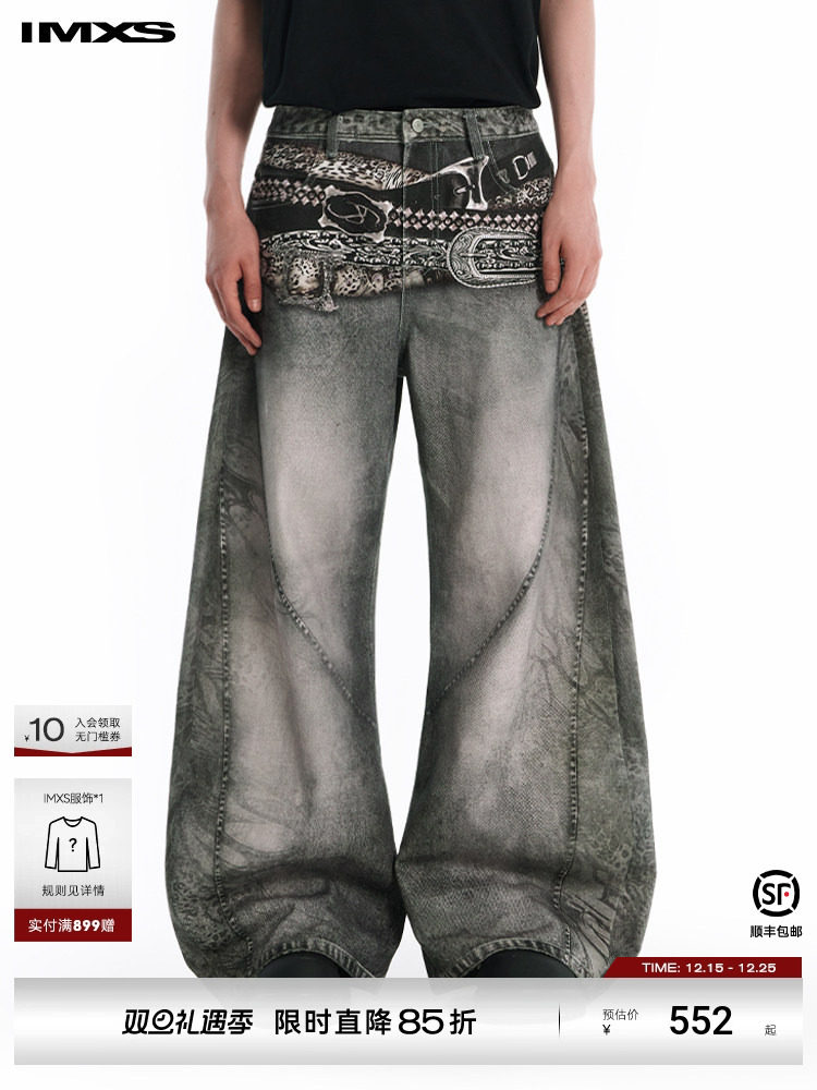 [Celebrity Style] Imxs Belt Print American Retro Scimitar Pants Relaxed Scythe Pants Jeans for Men and Women