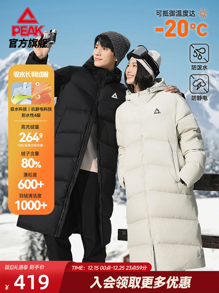 Peak Yuxue Long down Jacket | Outdoor Winter New Model Official Men's Hooded Warm Duck down Coat Women's Cotton Jacket