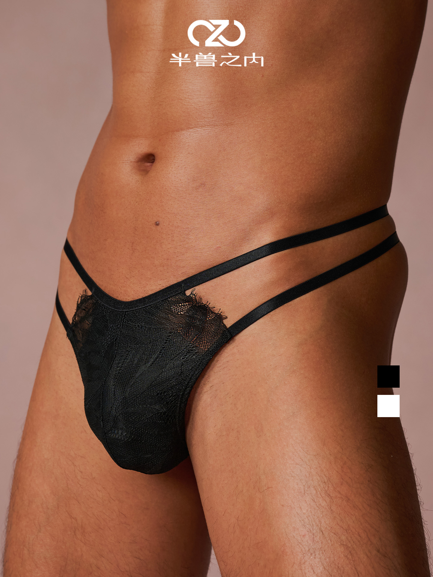 Half-Beast Style "Lace Marking" Series Low-Rise Sexy Thong with Single Strap, Large Lace Trim, Men's Underwear with Hollow Design