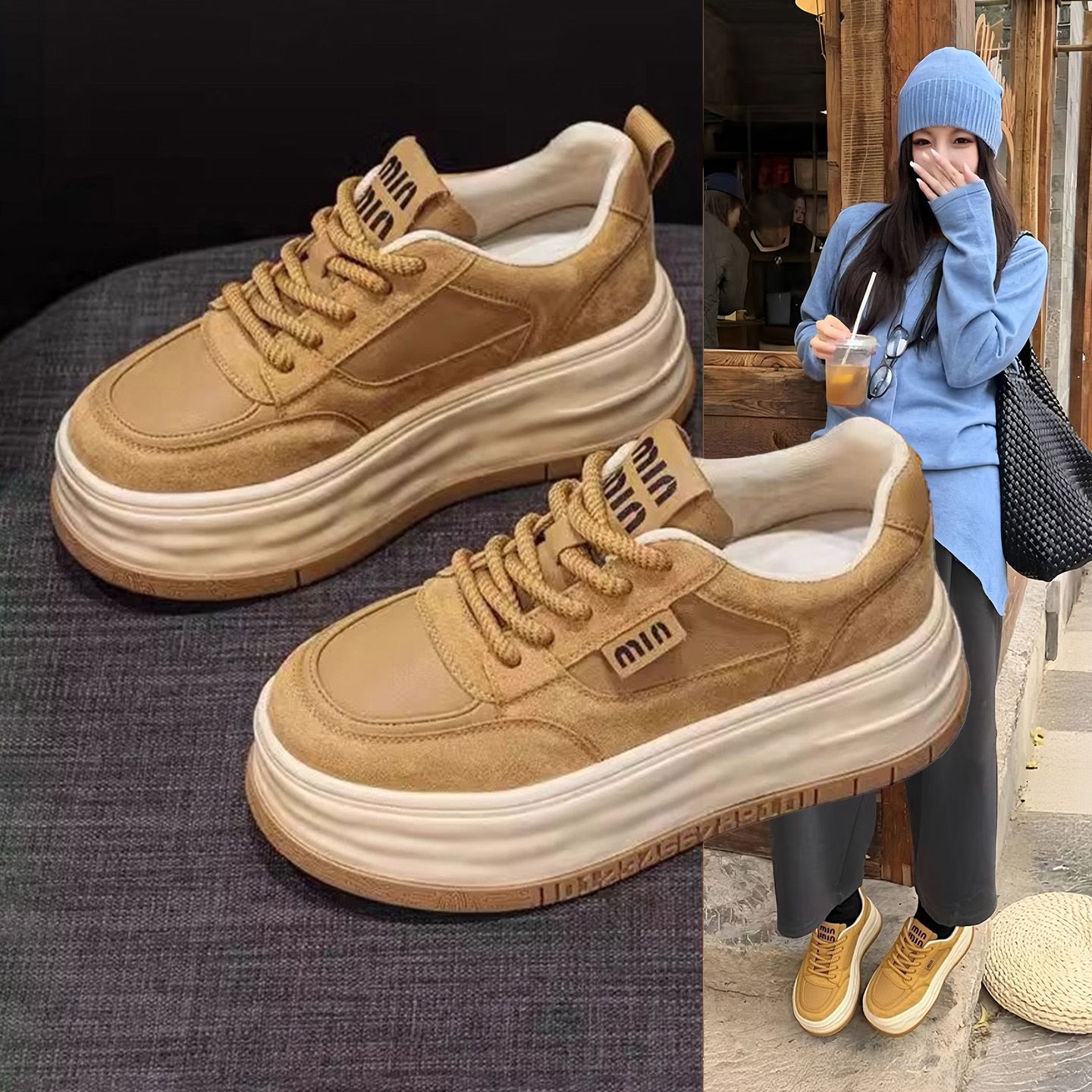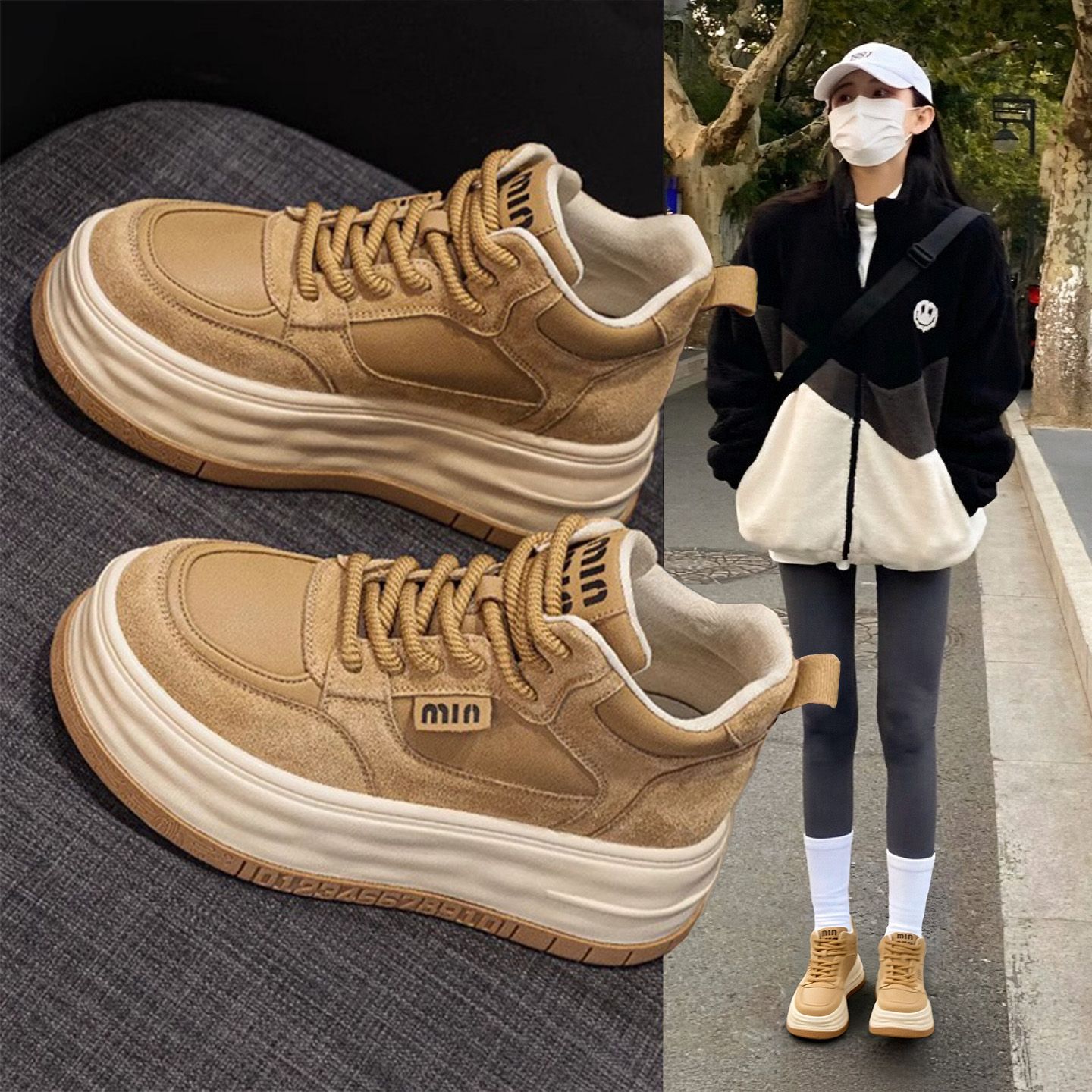 Hong Kong Genuine Leather Sneakers for Women 2025 Spring and Autumn New Style Fleece-Lined Suede Casual Shoes Retro Platform Thick-Soled Height-Increasing Shoes