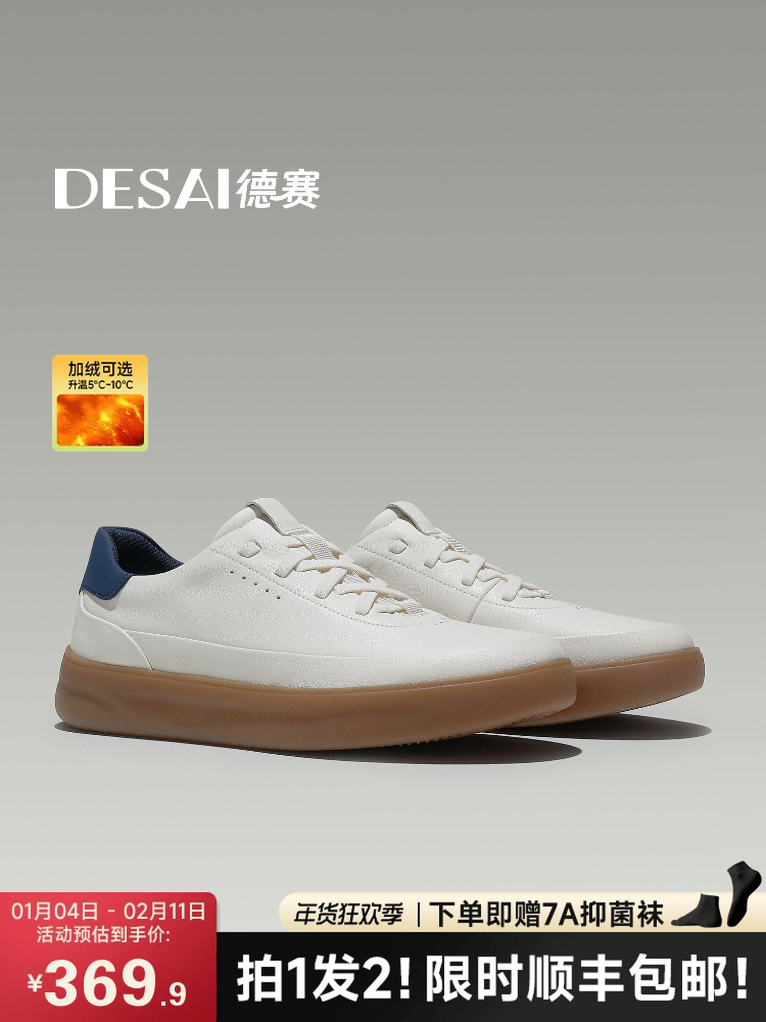 Desai Autumn and Winter Fleece-Lined Genuine Leather Men's Sneakers, Soft-Soled Breathable Non-Stuffy White Shoes, Lightweight Casual Shoes