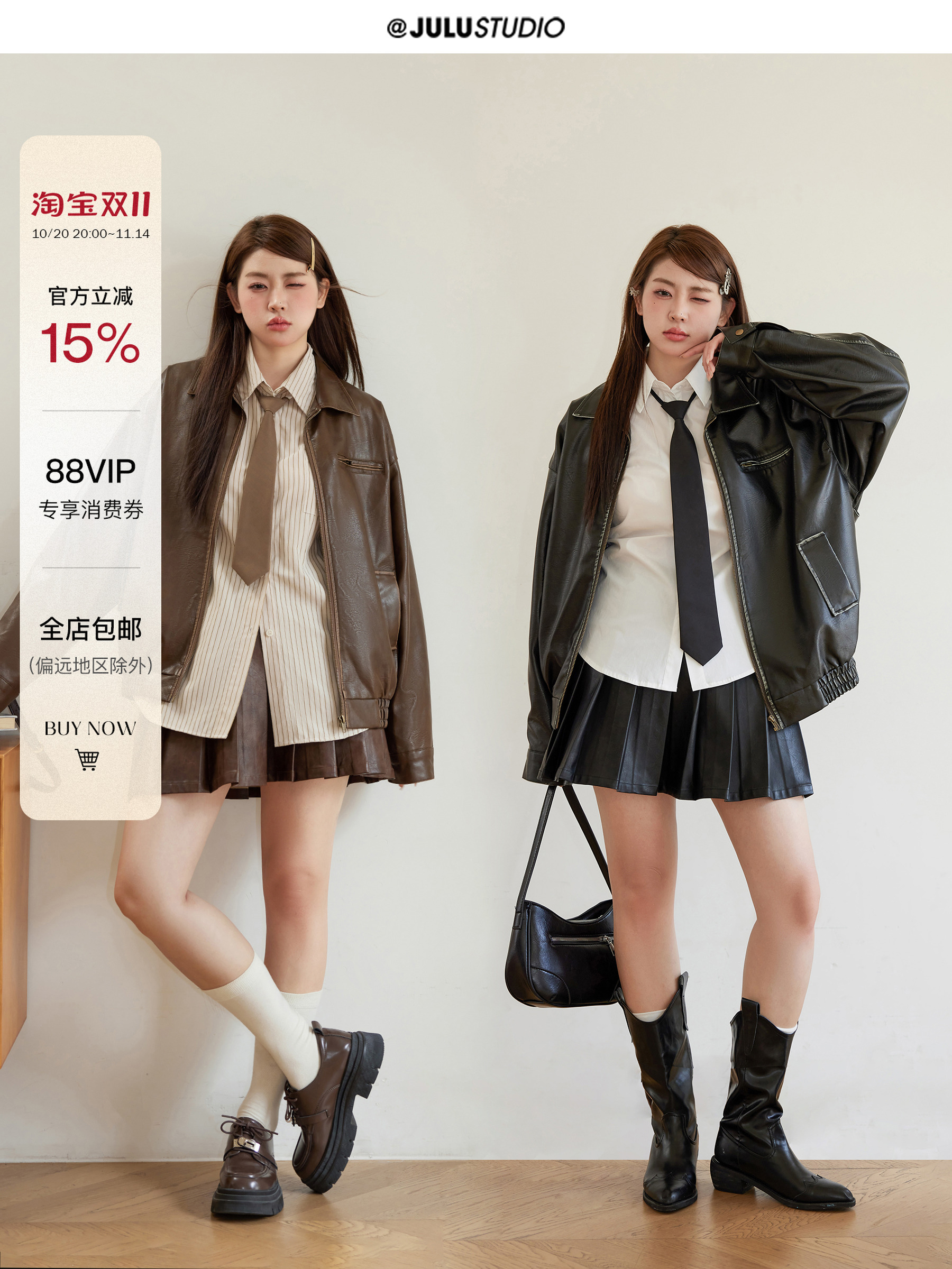 Julu Studio's "Retro Notting Hill" Loose-Fitting Cool Leather Jacket + Pleated Skirt Set for Slightly Chubby Women