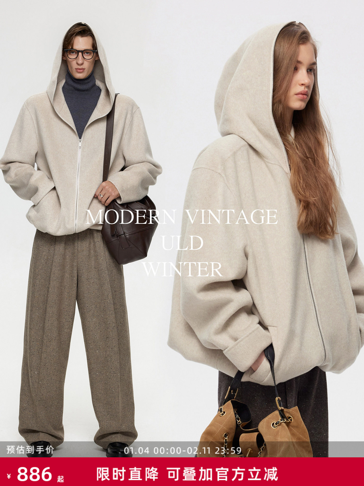 Uld/90S Vintage-Style Hooded Cloud-Like Wool and Cashmere Textured Handmade Double-Sided Nylon Short Jacket with Detachable Hem