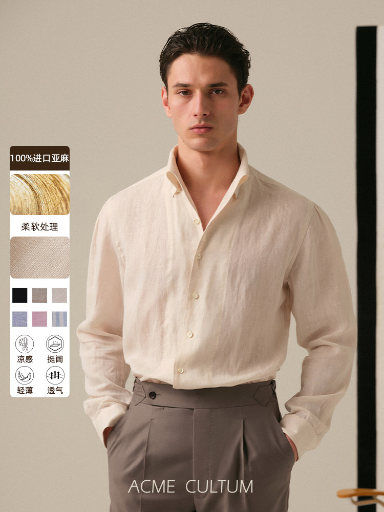 Acme Cultum Pure Linen Three-Step Hand-Pleated Long-Sleeve Vintage One-Collar Old Money Style Long-Sleeve Shirt for Men