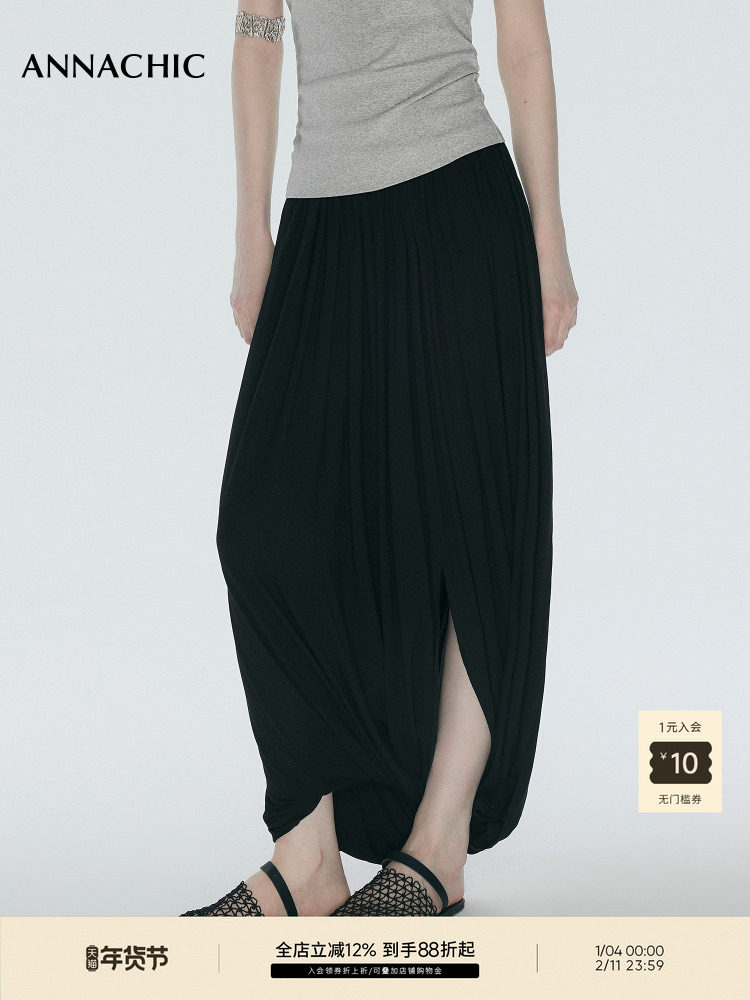 Annachic Fashionable Lazy Style Two-Way Wear Double-Layer Knotted Deconstructed Knit Long Skirt Culottes with a Flower Bud Design