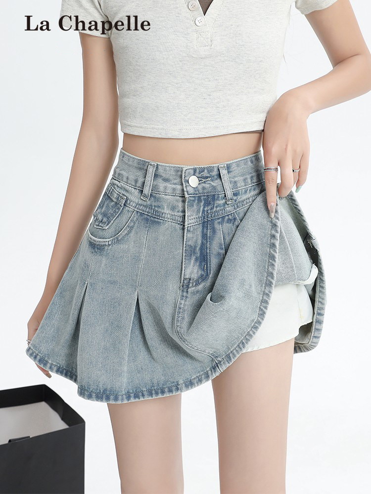 La Chapelle Light-Colored High-Waisted Denim Skirt for Women, 2026 New Spring Slimming A-Line Pleated Short Skirt