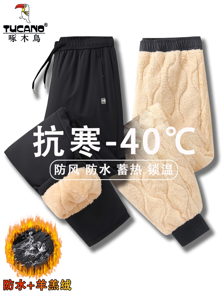 Woodpecker Brand Men's Winter Cotton Pants, Fleece-Lined and Thickened with Lamb Wool, Windproof and Warm, Men's Outdoor Pants