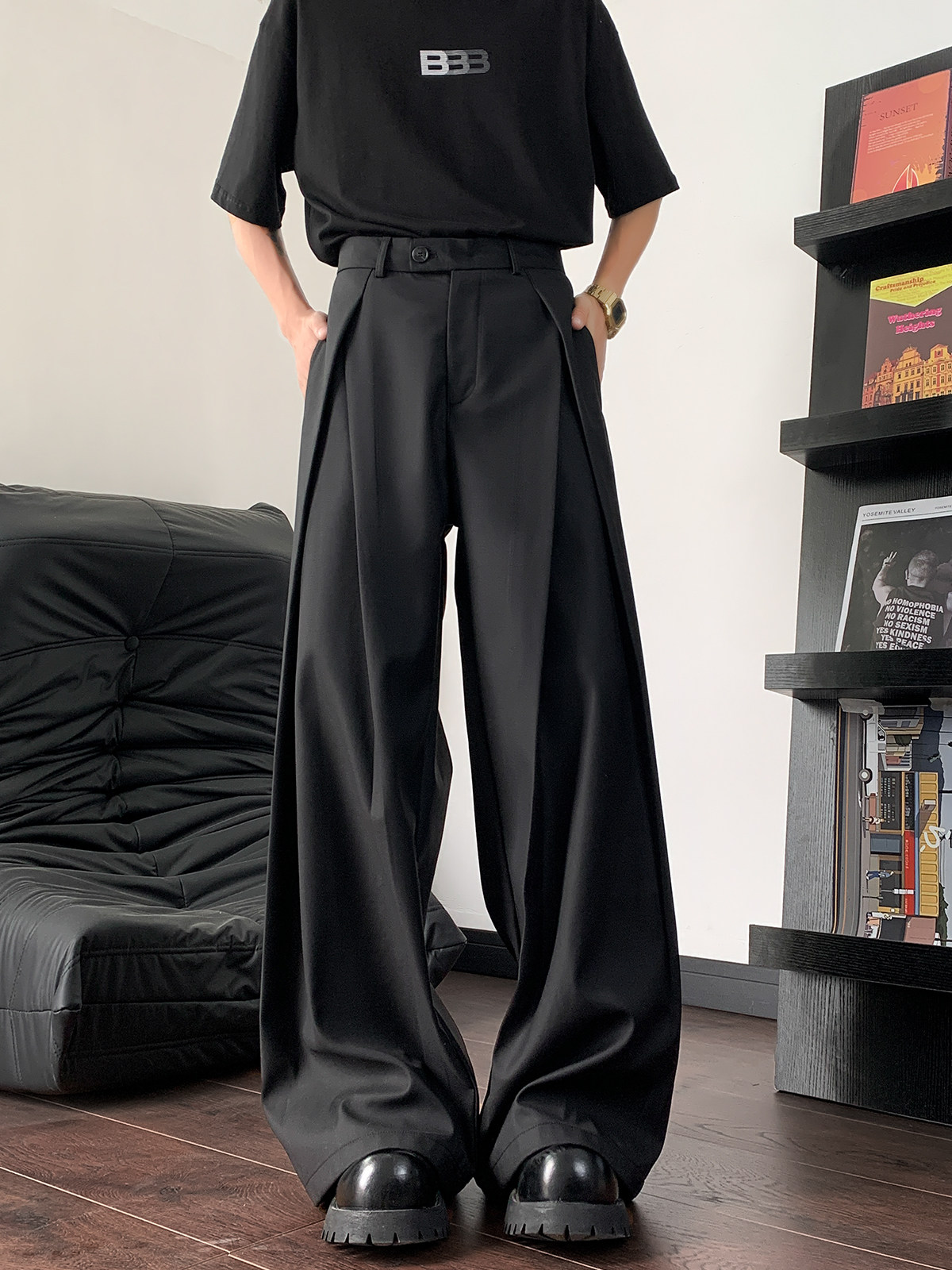 Three-Dimensional Pleated Silhouette Suit Pants for Men, American Style, High-End, Lazy Style, Loose, Casual, Drapey, Floor-Length Wide-Leg Suit Pants
