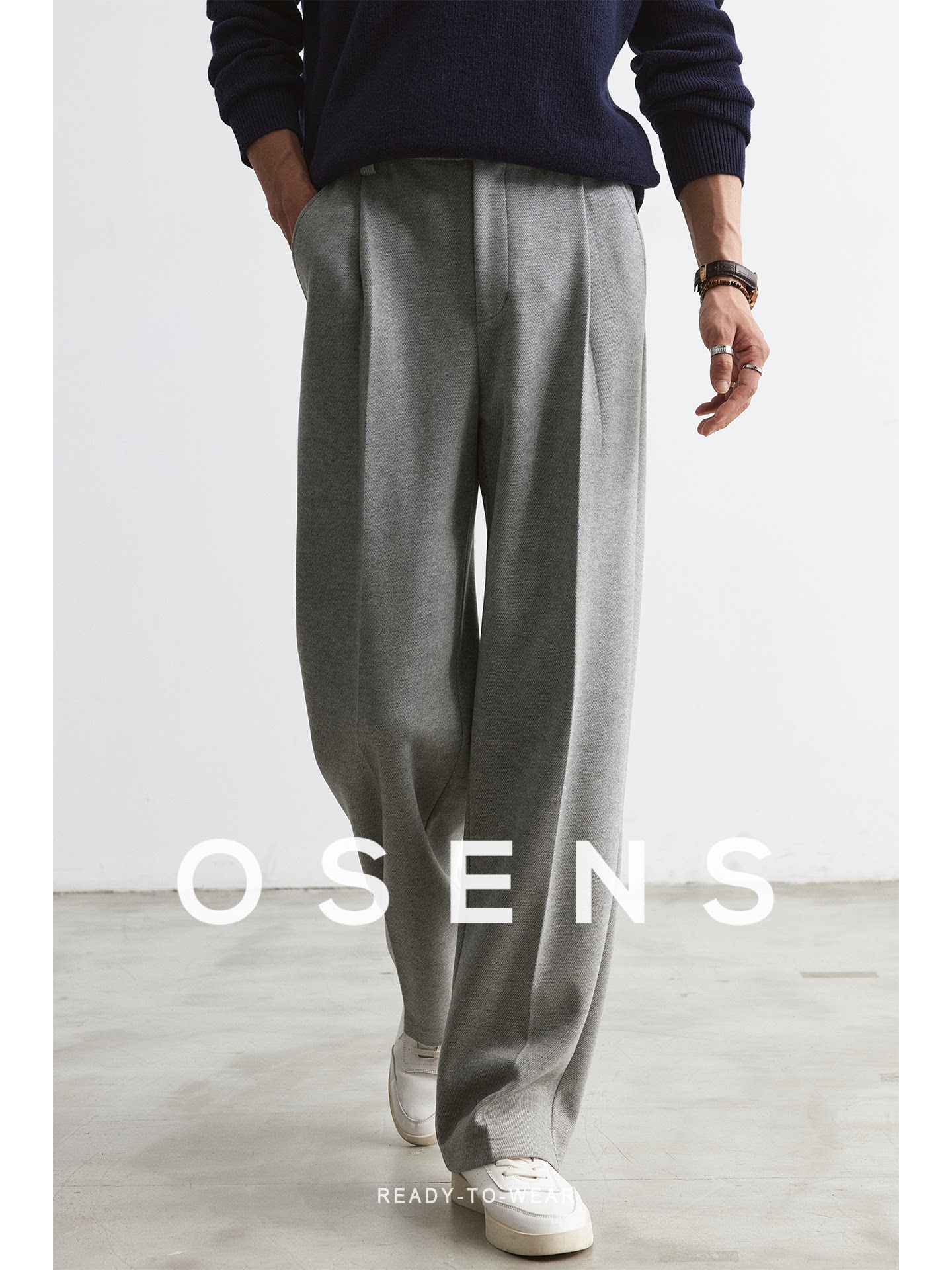 Osens Jacquard Woven Texture Business Commuter Wide-Leg Trousers with Three-Dimensional Single Pleat Elastic Waist Straight-Leg Casual Pants for Men