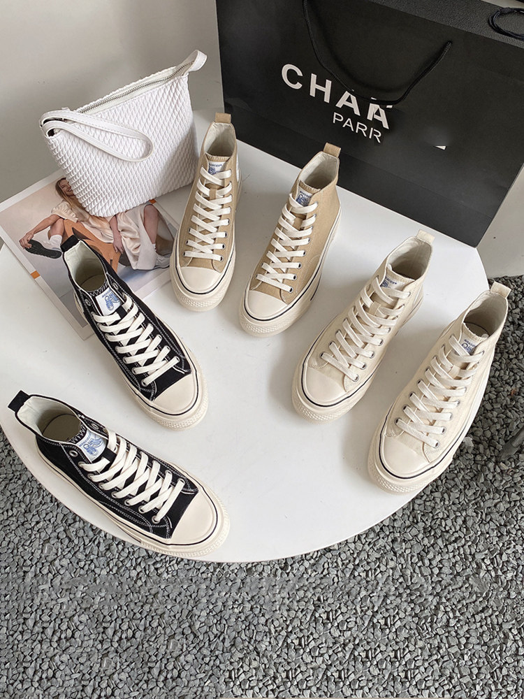 Hong Kong Canvas Shoes for Women 2025 New Korean Style Fashionable High-Top Shoes Versatile Genuine Leather Lining Lace-Up Thick-Soled Casual Shoes