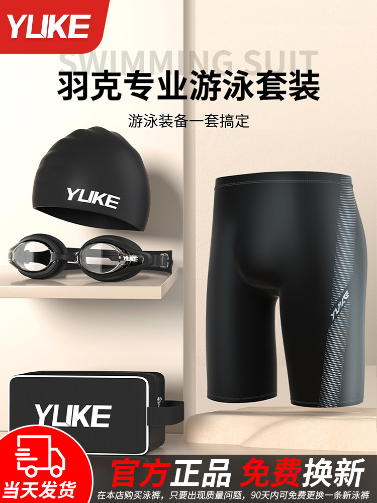 Men's Swimming Trunks, Professional Five-Point Length, Anti-Embarrassment, Large Size Swimming Gear, Hot Spring Men's Swimming Trunks, Swimming Cap, Swimming Goggles Three-Piece Set
