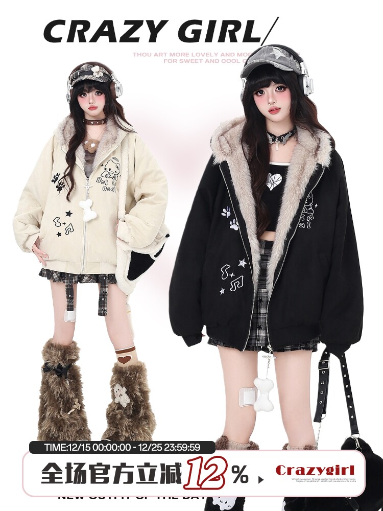 Crazygirl【The First Cute Goddess!】Home-Style Design Suede Plush Cat Ear Hooded Cotton Jacket for Winter