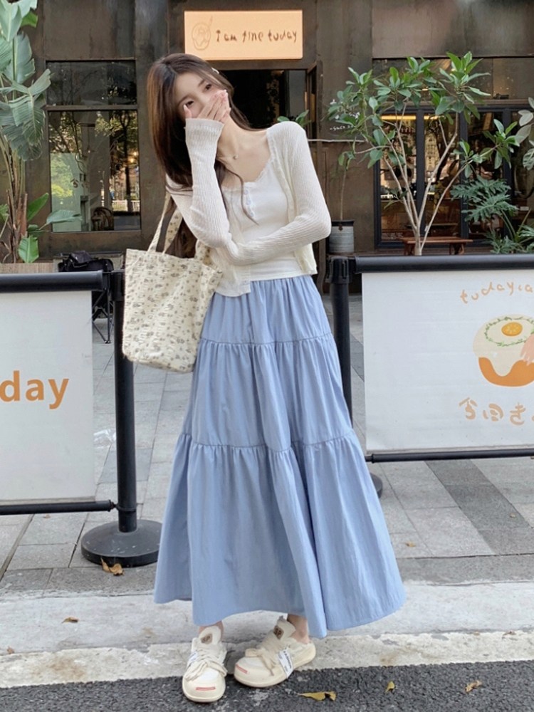 Gentle and Sweet, Age-Reducing Blue Skirt, 2025 Autumn New Versatile Slimming Layered A-Line Long Skirt for Women