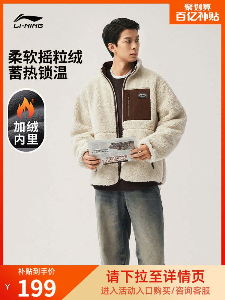 Li-Ning Women's Thick Windproof Fleece Jacket, Couple's Fleece Top, Warm Cotton Coat, Windproof Retro Jacket for Men