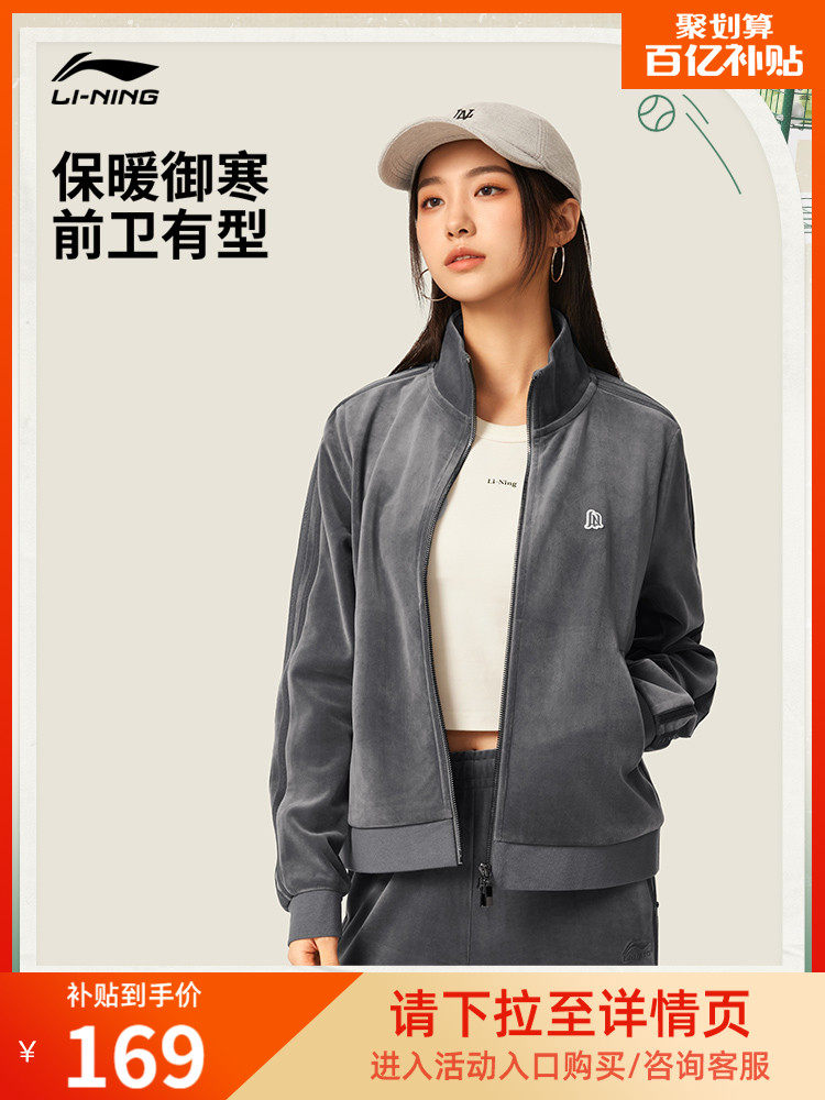 Li-Ning Velvet Jacket for Women, 2025 Winter New Style, Zip-Up, Regular Shoulder Sweatshirt, Stand Collar Top, Knitted Sportswear for Women