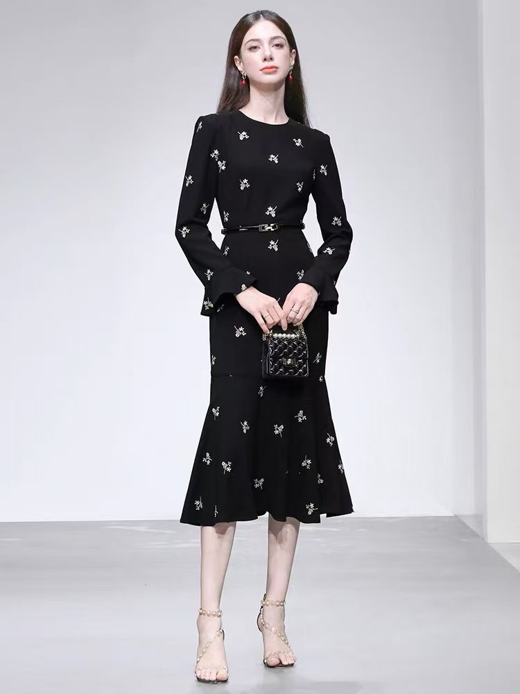 Hanfu Autumn New Style Ladylike Round Neck Long-Sleeved Dress with Waist-Cinching, Slimming, Ruffled and Embroidered Dress for Women