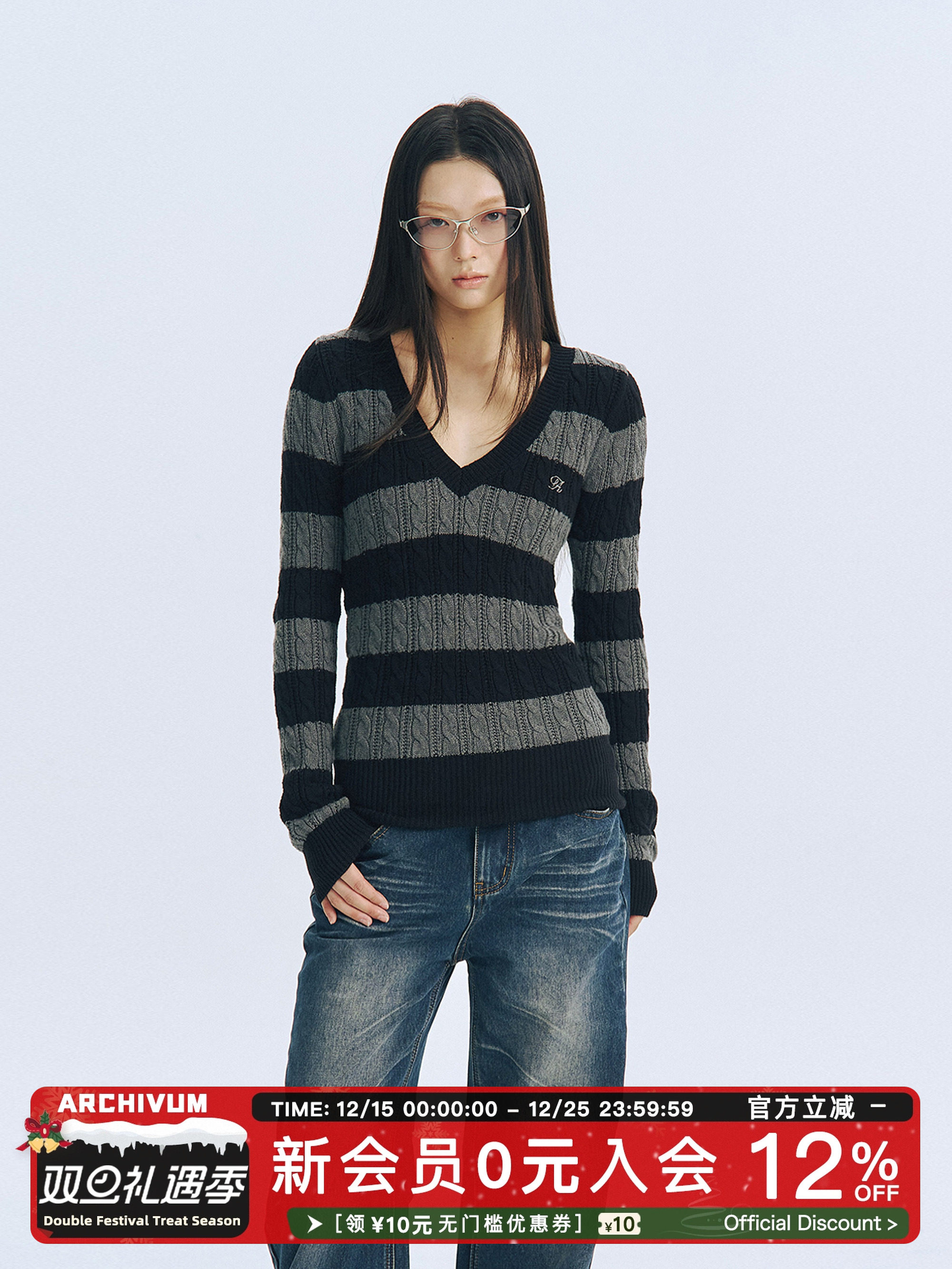 Archivum Versatile V-Neck Cable Knit Striped Lazy Sweater for Women, Autumn Loose-Fitting Couple Knit Top Trendy