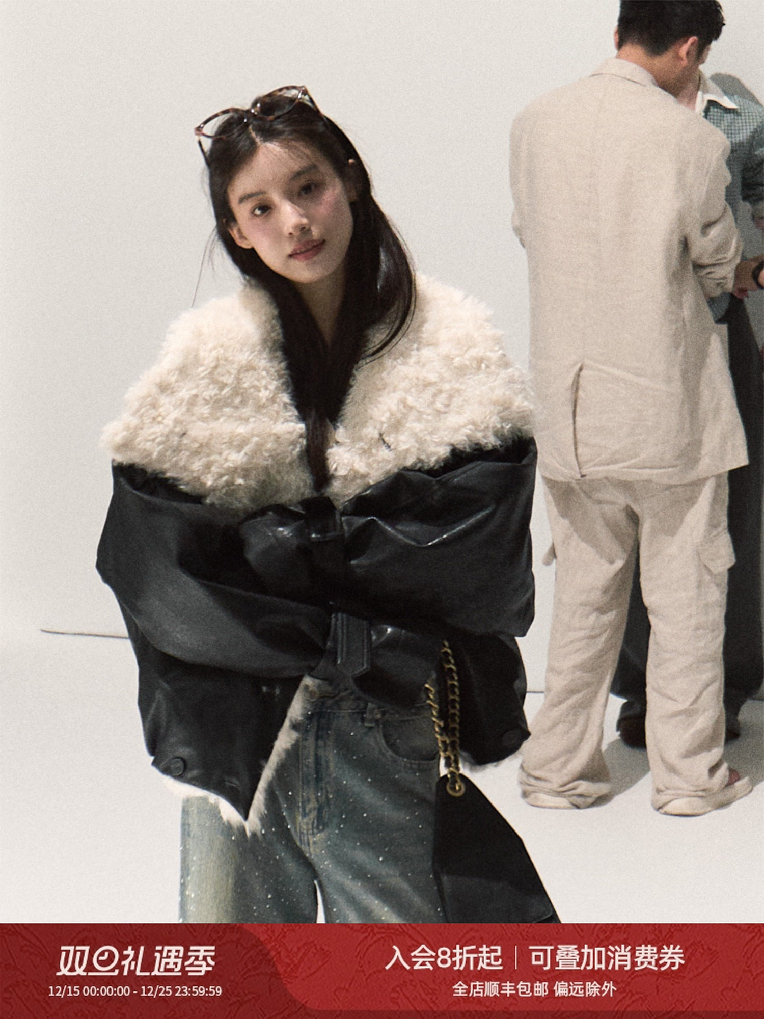 Oakmoo/ "A Night of Osmanthus Trees" Lamb Wool Short Leather Jacket for Women, Thickened Turn-Down Collar Parka for Winter