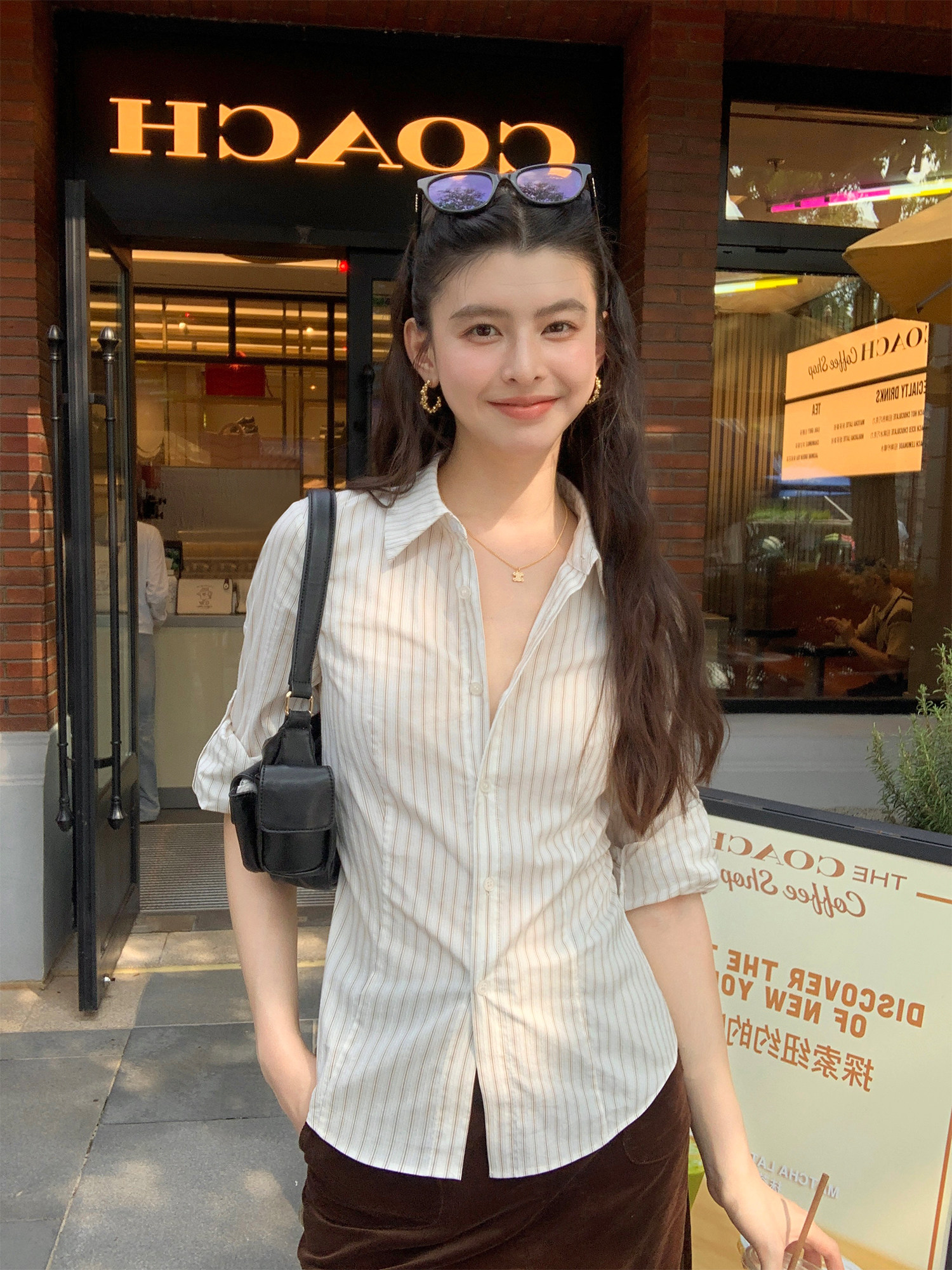 Pusumede Intellectual Roaming Salt-Style Striped Lapel Shirt Women's Long-Sleeved Shirt Elegant Slim-Fit Layered Top