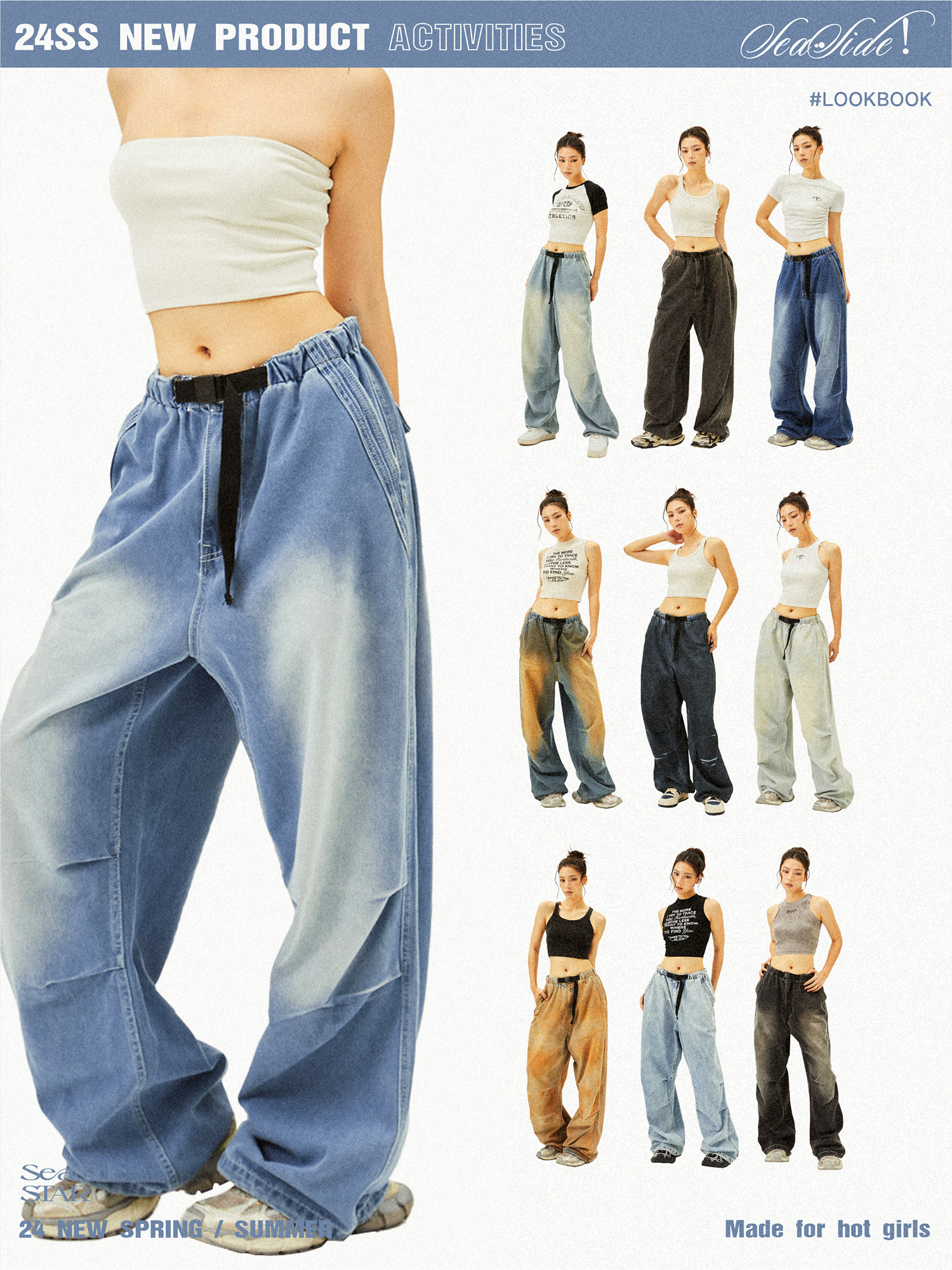 Seaside American Street Style Washed Spray Horse-Print Jeans for Women, Spring and Summer Jazz Hip-Hop Trendy Brand Sports Wide-Leg Pants