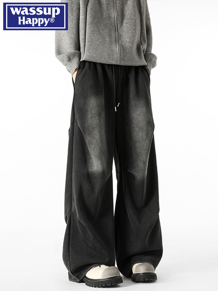 Wassup Happy Autumn/Winter Work Pants for Men, American Style, Fleece-Lined, Draped Wide-Leg, Trendy Brand, Straight-Leg Casual Pants