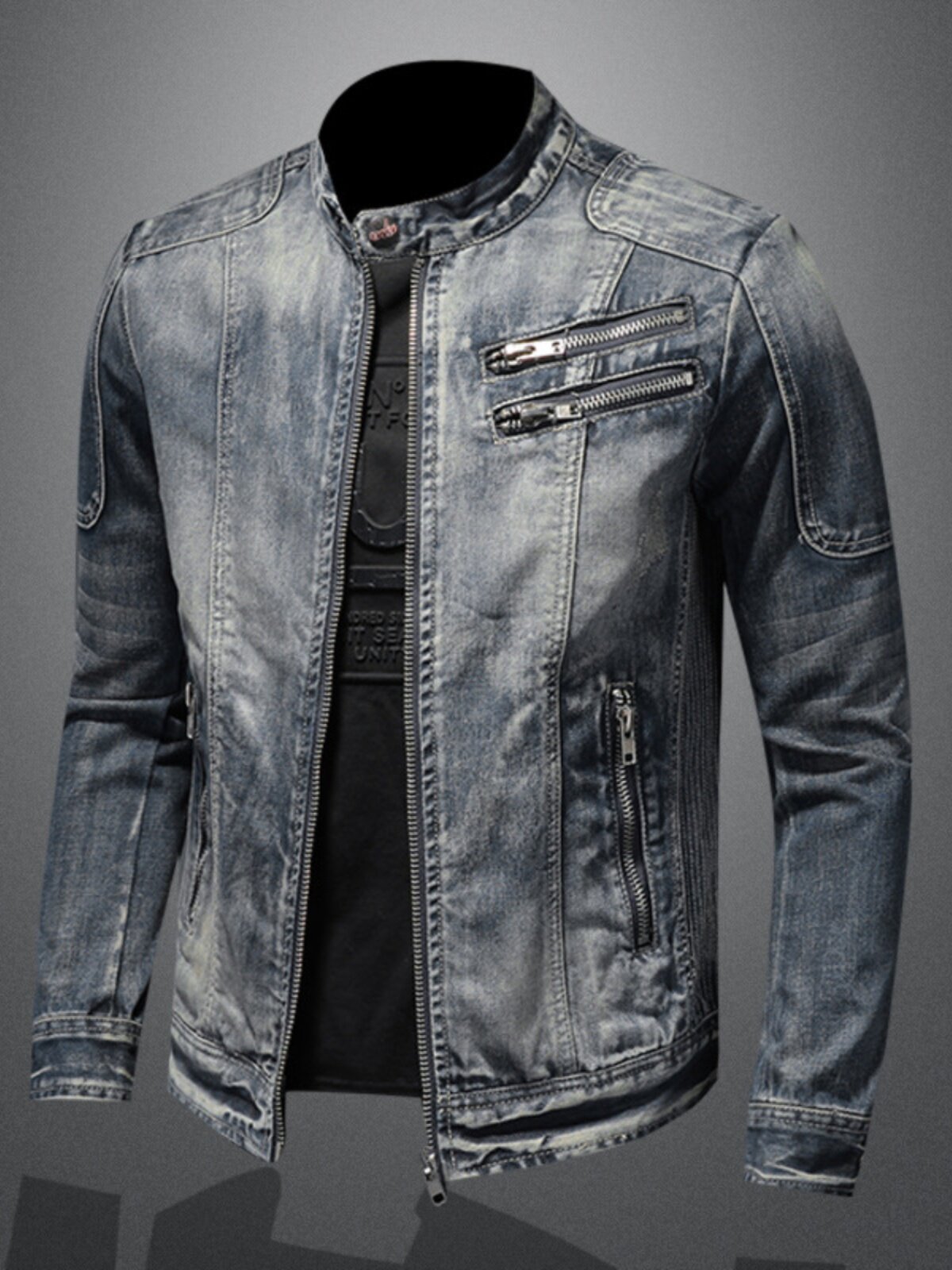 New Autumn and Winter Men's Denim Jacket European and American Casual Retro Slim Fit Stand Collar Zipper Jacket Motorcycle Riding Clothing Trendy