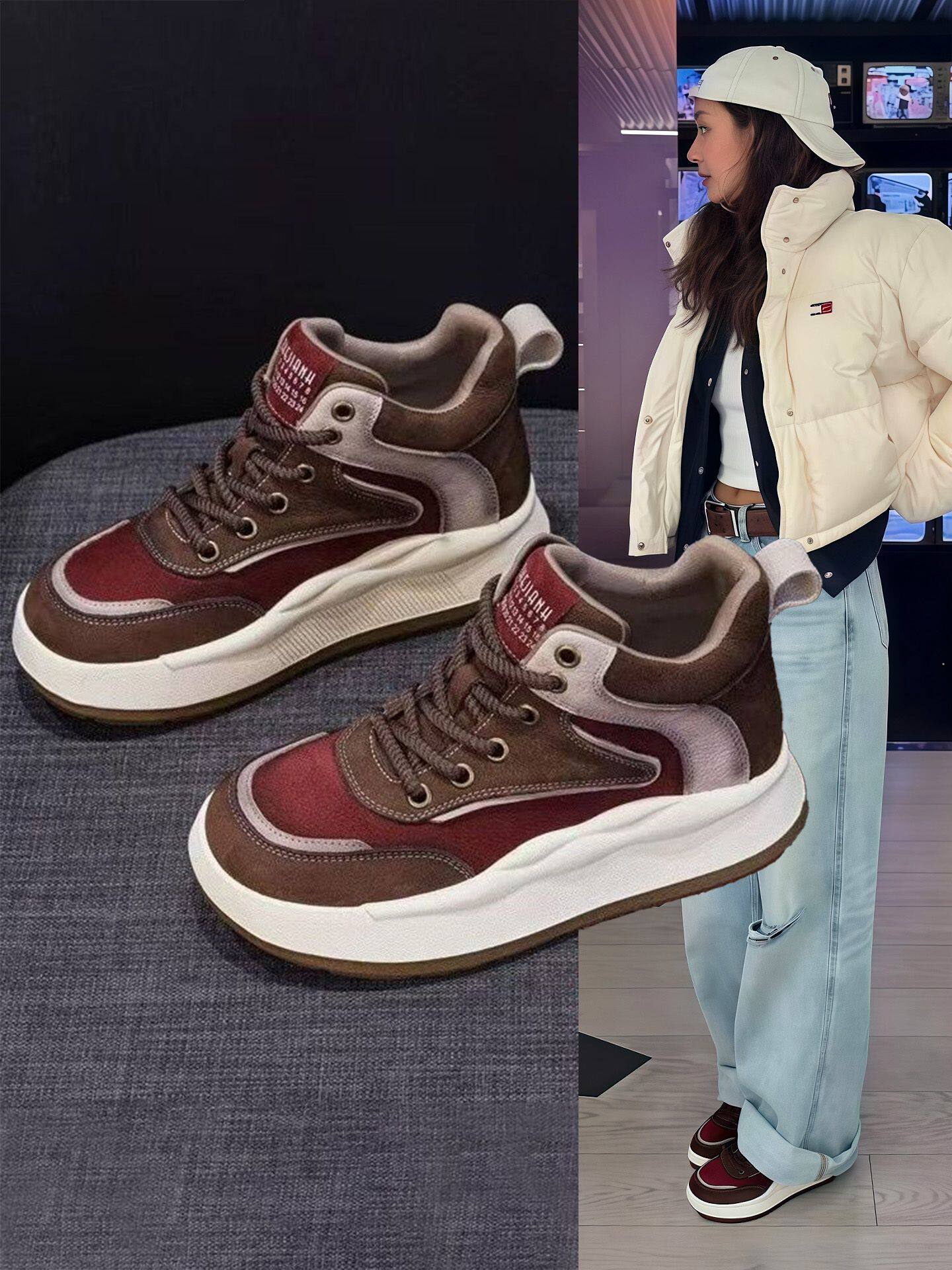 Hong Kong Retro High-Top Shoes for Women 2025 Autumn and Winter New Style Fleece-Lined Thick-Soled Genuine Leather Color-Blocked Sports Casual Shoes ins Trendy