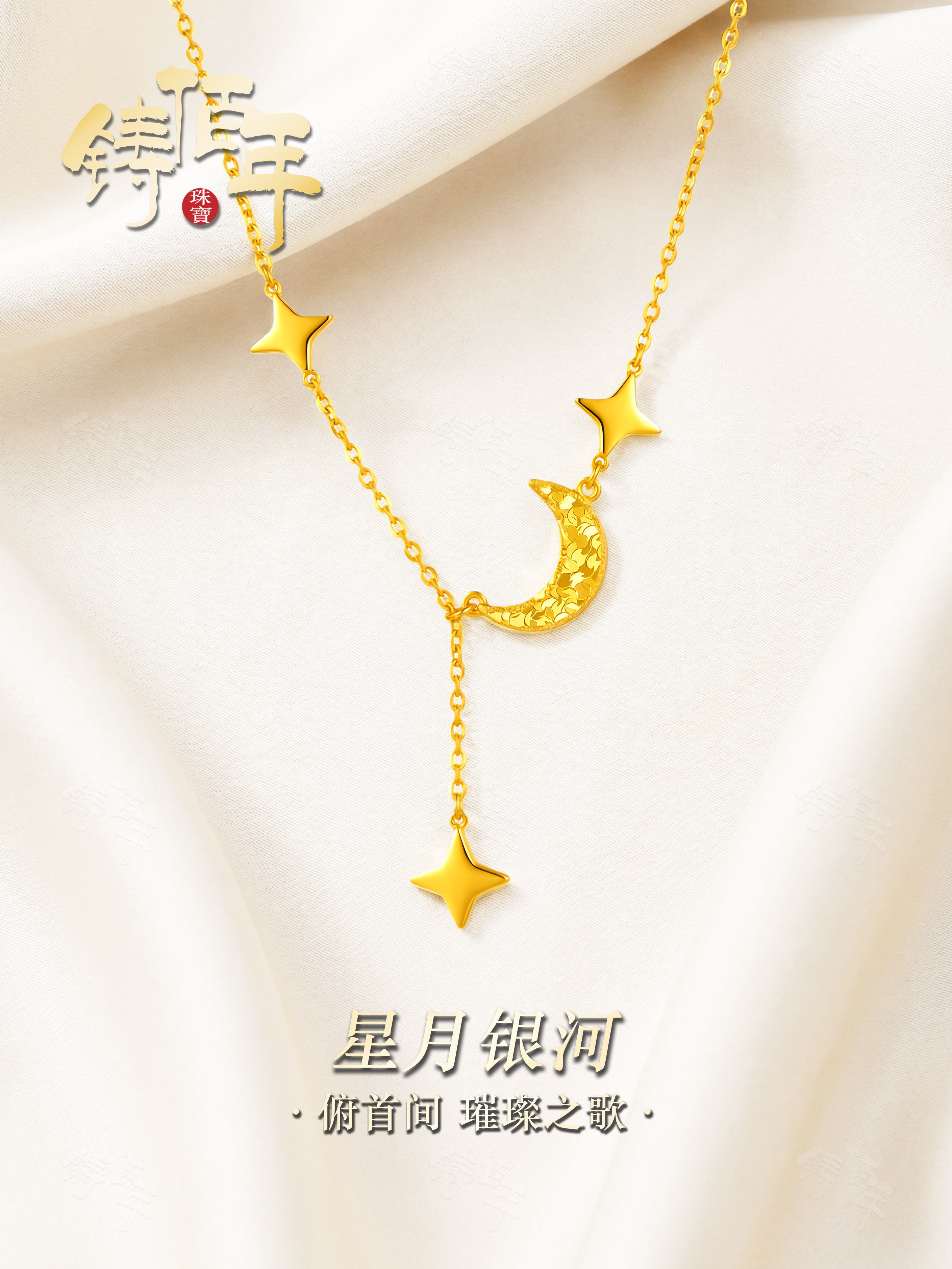 Gold-Plated Silver Crushed Ice Star and Moon Necklace, New Chinese Style Exquisite Four-Pointed Star Tassel Clavicle Chain, High-End Versatile Women's Accessory
