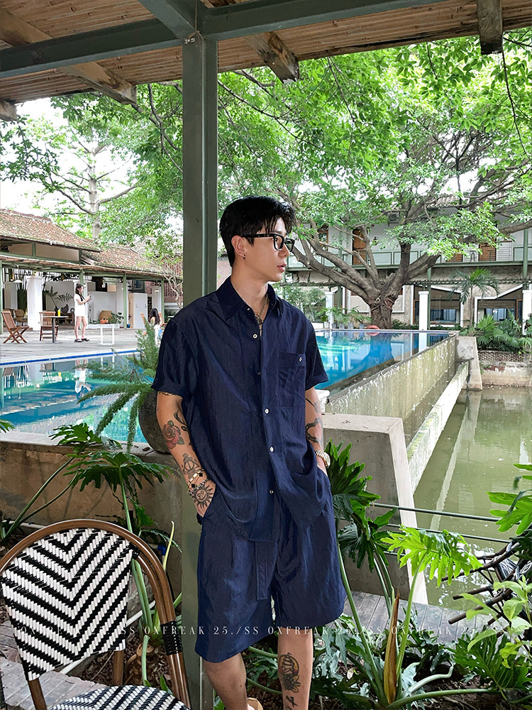 Oxfreak'Old Money Style Ice Silk Wrinkle' Vacation Style Casual Suit for Men, High-End Short Sleeve Shirt and Shorts