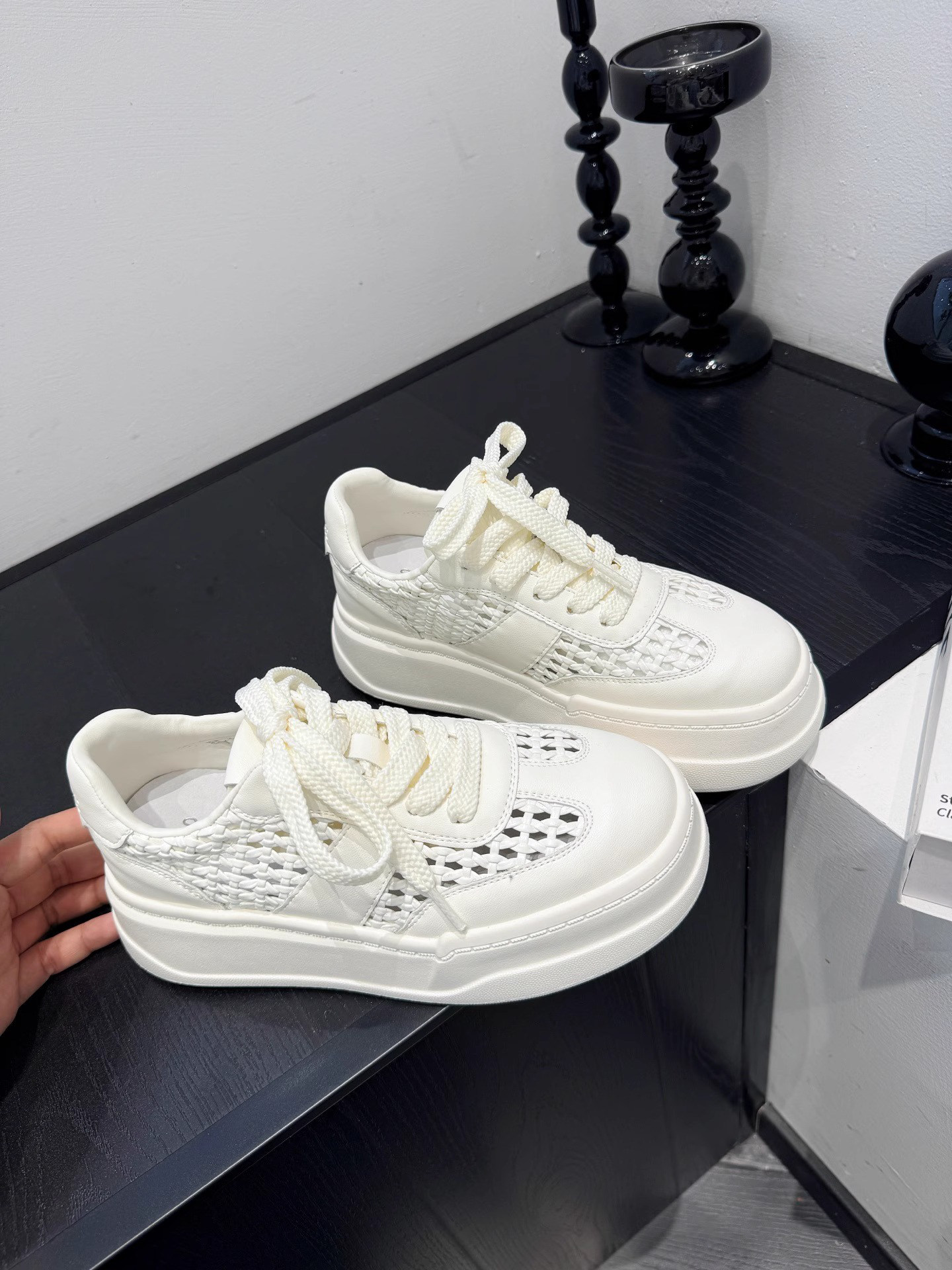 Hong Kong Fashion Thick-Soled Height-Increasing Genuine Leather Hollow Mesh White Sneakers for Women 2025 Summer Petite Platform Casual Sneakers