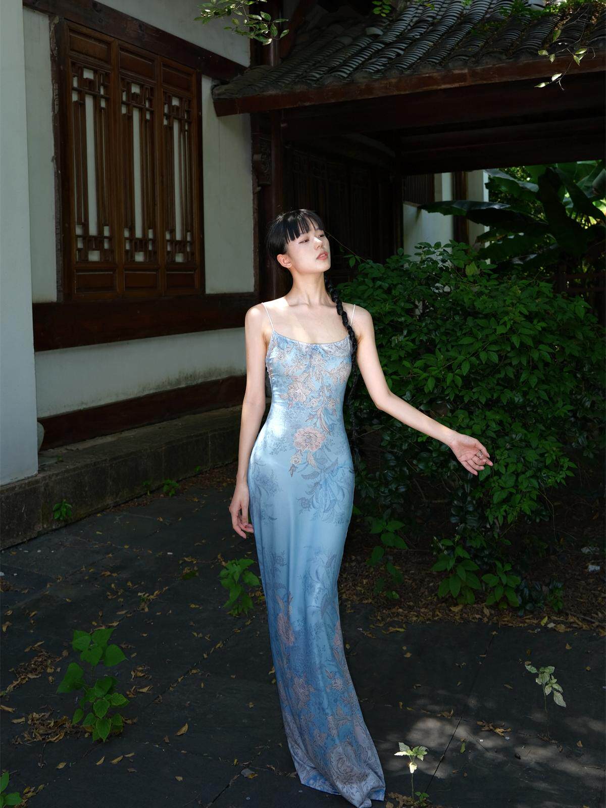 Xiao Juchuanli/Lan Teng Yue Xue Skirt, Classical Blue Retro Tie-Dye Island Vacation Style Slim-Fit Spaghetti Strap Dress