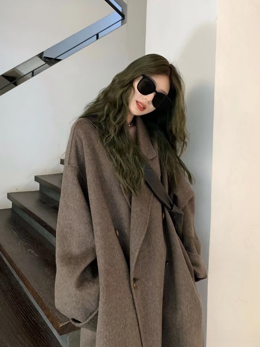 Mocha Brown Double-Sided Cashmere Coat for Women, Mid-Length, Lazy Style, 2025 New Korean Style Loose Woolen Coat