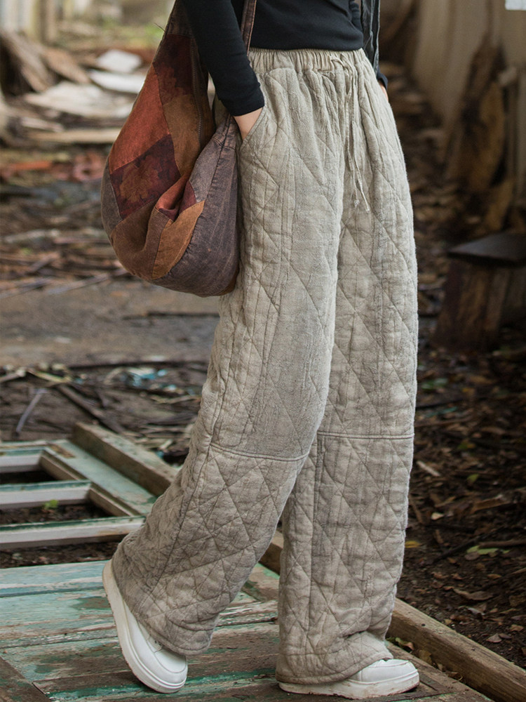 Warm Cotton Pants for Women, New Winter Style, Quilted Straight-Leg Pants, High-End Original Ramie Tie-Dye, Elastic Waist, Thickened Long Trousers